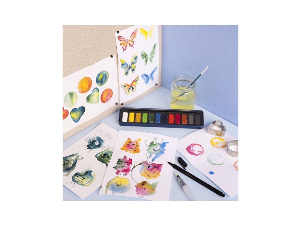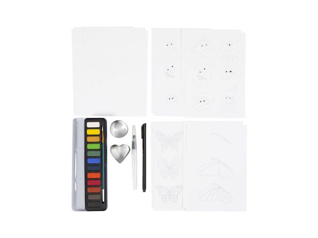 • V sade nájdete všetko potrebné – akvarelovú paletu, vodný štetec, formy, papier aj fix