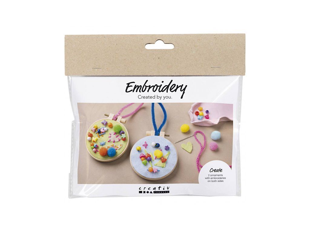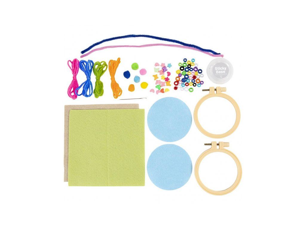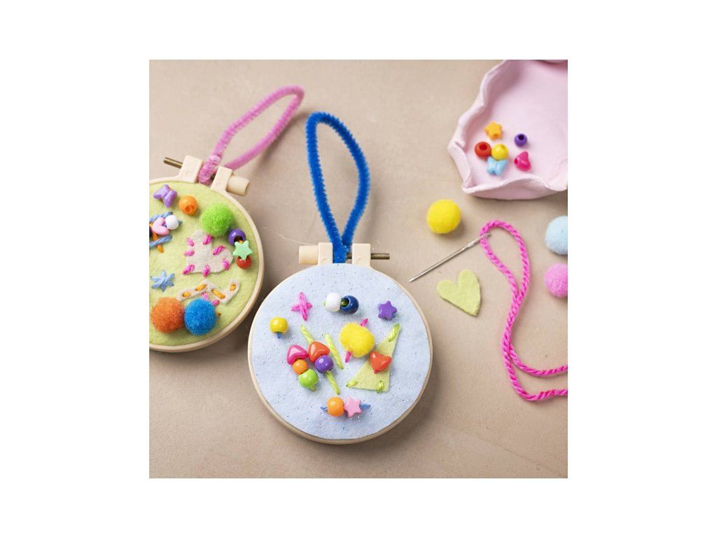Objavte radosť z tvorenia s touto krásnou sadou, ktorá deťom umožní vytvoriť farebné závesné dekorácie z pomponkov, plste, korálikov a výšivky Ideálne pre prvé zoznámenie s vyšívaním aj ako zábavný projekt pre rozvoj fantázie a jemnej motoriky.