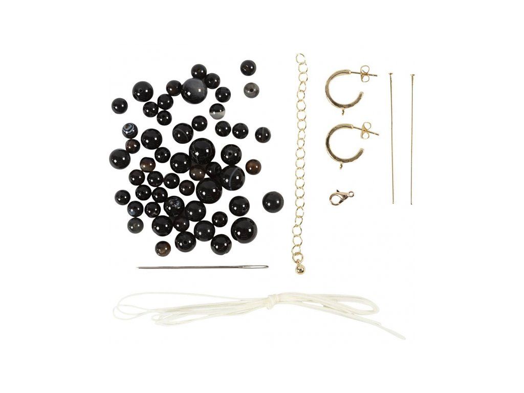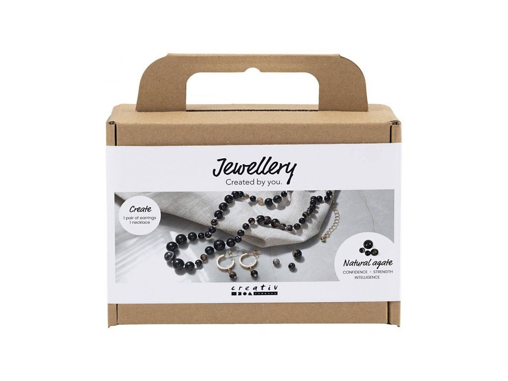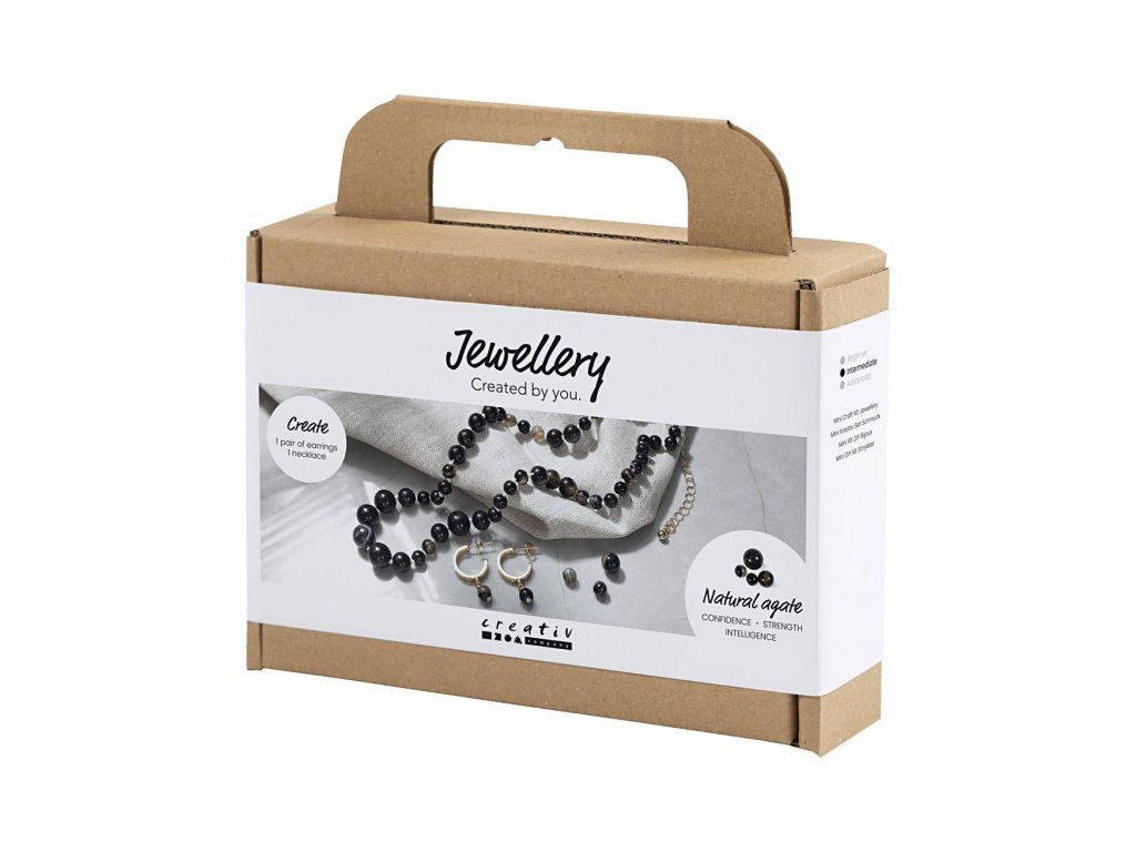 Ručne vyrobené šperky s hlbokým významom. Táto kreatívna súprava vám umožní vytvoriť náhrdelník a pár náušníc s prírodnými korálkami z achátu – polodrahokamu známeho svojim mystickým vrstveným vzhľadom a posilňujúcou energiou.