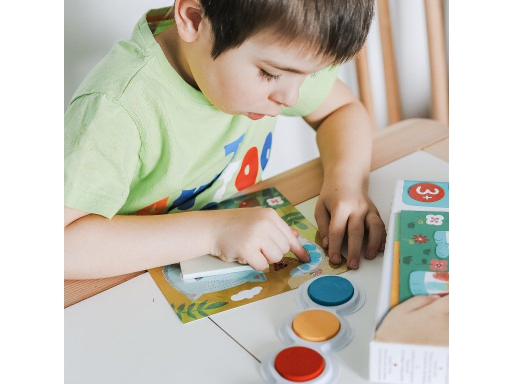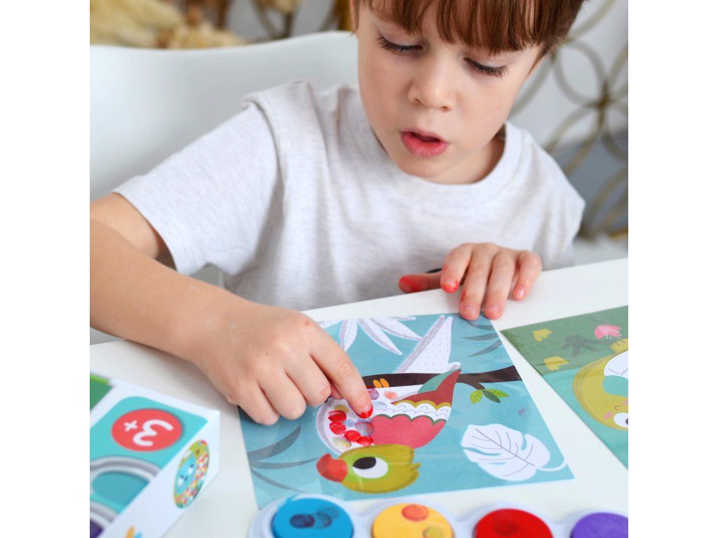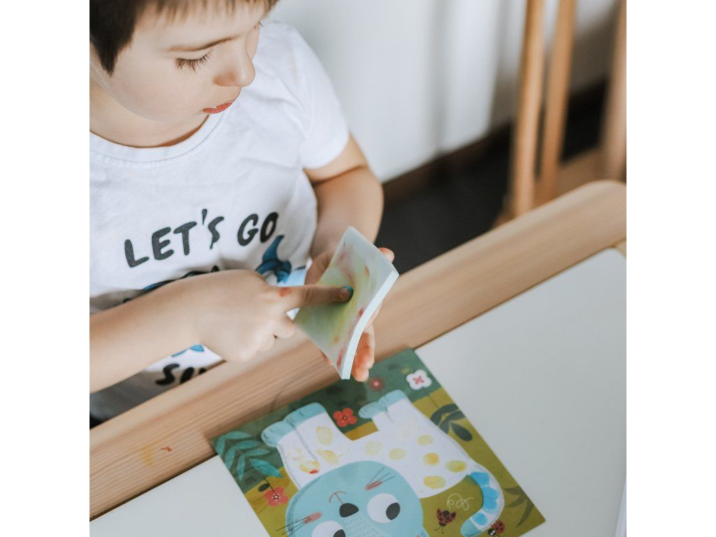 V balení je aj handrička na utieranie prstov a pomôcka na vystavenie hotových obrázkov, aby dieťa videlo výsledok aj mimo stola.