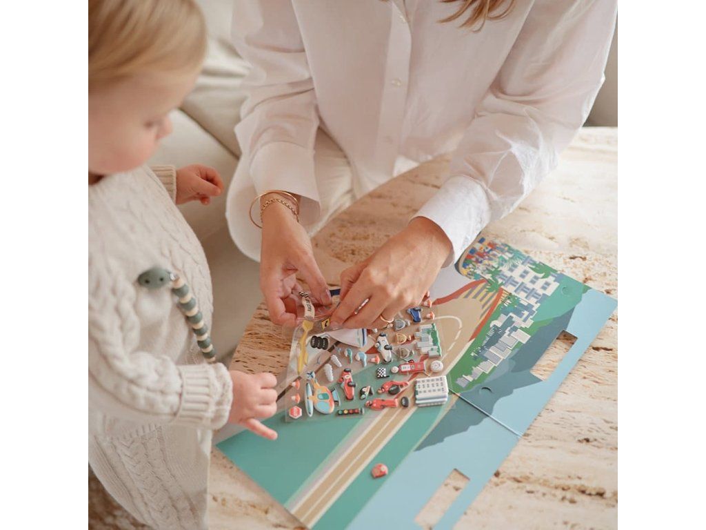 Opätovne použiteľné nafúknuté nálepky vr. knižka s nálepkami pre deti, ktoré milujú závodné autá! Nálepky sa dajú použiť znova a znova a ich rôzne farby a tvary okamžite upútajú pozornosť tých najmenších. Nálepky podporia kreativitu detí, zatiaľ čo vo svojej knižke so samolepkami vytvoria jedinečné rozprávanie. Nálepky naučia deti aj o závodných autách, vďaka čomu sú hravé a zároveň náučné. Okrem toho nálepky tiež poskytujú množstvo vývojových výhod; napríklad odlepenie nálepiek a ich umiestnenie na iný povrch si vyžaduje presnosť a kontrolu, ktorá postupne zlepšuje koordináciu ruka-oko. Mushie Reusable Sticker Set (Race cars) – detaily Odporúčaný vek: 3+ roky Materiál: Kniha: Papier - Nálepka: PVCDodatočné parametre