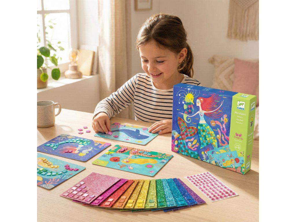 Penová mozaika Morské panny Tvorba podľa čísel Podmorská mozaika, ktorá sa ligotá: nalep trblietavé štvorčeky podľa čísel a dozdob obrázky kamienkamiMozaika Morské panny je kreatívna sada, v ktorej deti vytvárajú žiarivé podmorské scény pomocou samolepiacich penových mozaikových štvorčekov s trblietavým efektom.Na kartách sú vyznačené číselné políčka – dieťa nájde rovnaké číslo na hárku mozaiky a nalepí správnu farbu na správne miesto.Keď je mozaika hotová, doplní sa lesk ešte viac pomocou samolepiacich kamienkov.Rýchly prehľad odporúčaný vek: 7–13 rokov rozvíja: jemnú motoriku, presnosť, sústredenie, trpezlivosť, vnímanie farieb a čísel v balení: 4 ilustrované karty 19,5 × 26 cm, 16 hárkov trblietavých penových štvorčekov, 4 hárky samolepiacich kamienkov, farebný návodPrečo si ju deti zamilujú trblietavé štvorčeky a kamienky vytvoria výrazný „wow“ efekt číselný systém vedie krok po kroku – tvorenie je prehľadné a upokojujúce samolepiace dieliky znamenajú čistú prácu bez lepidla hotové obrázky sú krásne ako dekorácia do izbyAko to funguje Vyber jednu kartu a pozri si očíslované políčka. Nájdi na hárku mozaiky farbu s rovnakým číslom. Odlep štvorček a nalep ho na správne miesto na obrázku. Na záver doplň detaily kamienkami a dokonči všetky 4 motívy.Obsah balenia 4× ilustrovaná karta (19,5 × 26 cm) 16× hárok trblietavých penových štvorčekov 4× hárok samolepiacich kamienkov 1× farebný návod krok za krokomTechnické parametre materiál: kartón, penové samolepiace dieliky, dekoratívne kamienky počet obrázkov: 4 rozmer obrázkov: 19,5 × 26 cm rozmery balenia: cca 27,5 × 21,5 × 4 cm odporúčaný vek: 7–13 rokovDodatočné parametre