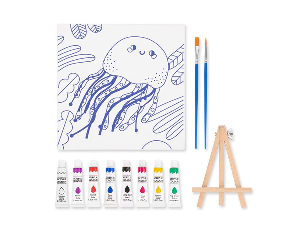 Temperové farby a plátno Medúza Poteší každého malého umelca! Set s maľovaním na plátno s predlohou malej milej medúzy. Súčasťou balenia sú aj dva štetce a set temperových farieb.Dieťa si trénuje kreativitu a precíznosť. Dokončený obrázok môžete postaviť na drevený podstavec a vystaviť.Dodatočné parametre