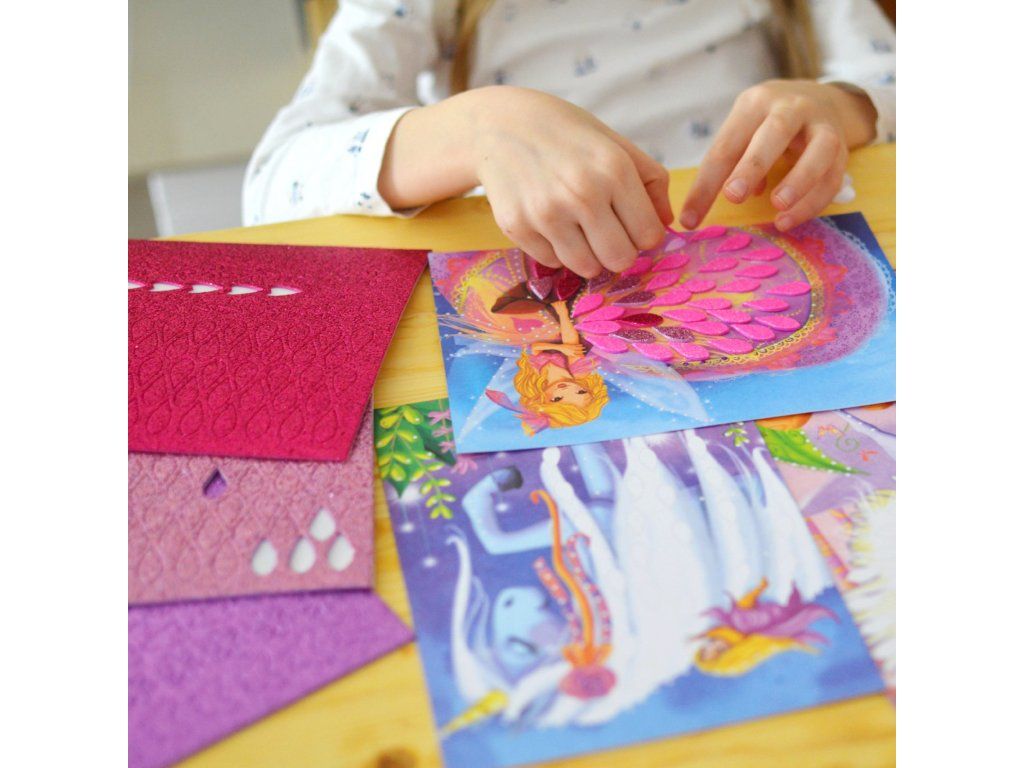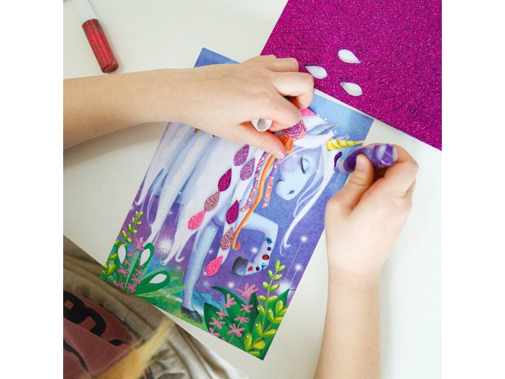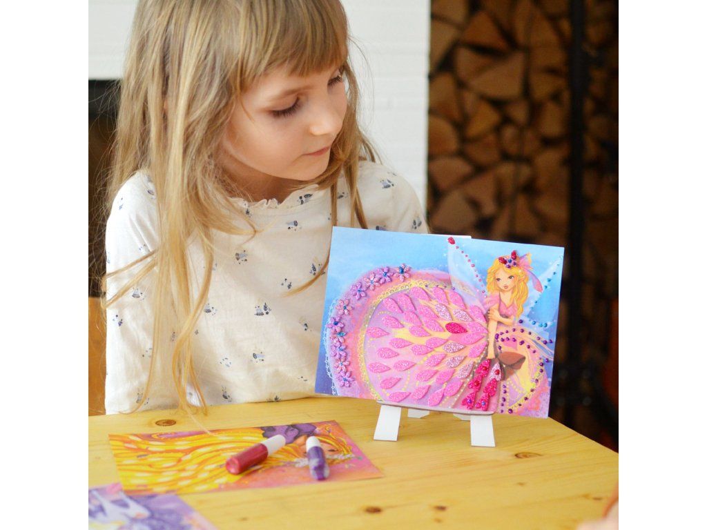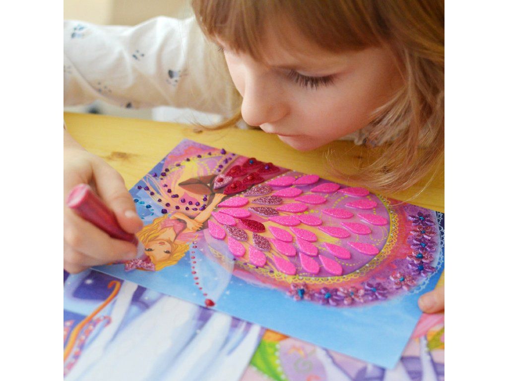 Tvorenie je prehľadné: dieťa si vyberie obrázok, dopĺňa ozdoby podľa vlastnej fantázie (alebo podľa naznačených plôch) a pridáva trblietky na miesta, ktoré chce zvýrazniť. Hotové obrázky sa dajú postaviť na skladací stojan, takže vznikne aj krásna dekorácia do izby alebo darček pre blízkych.
