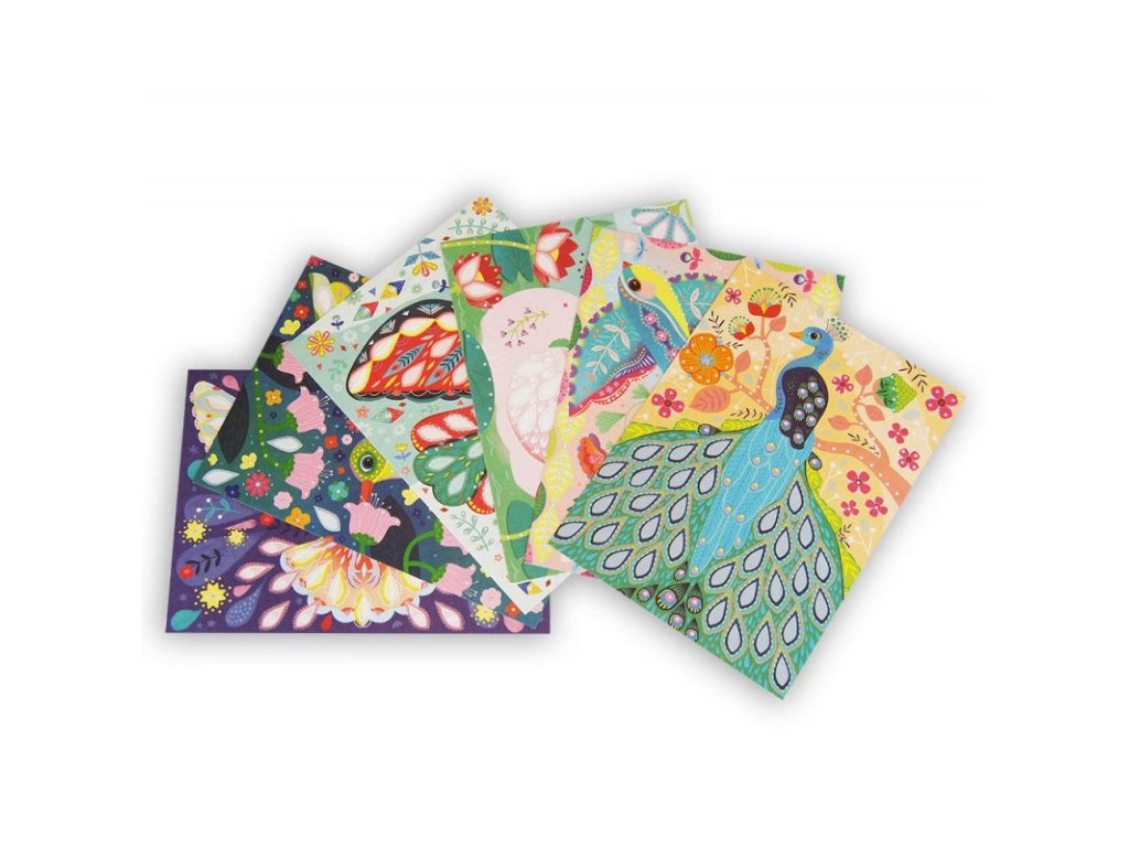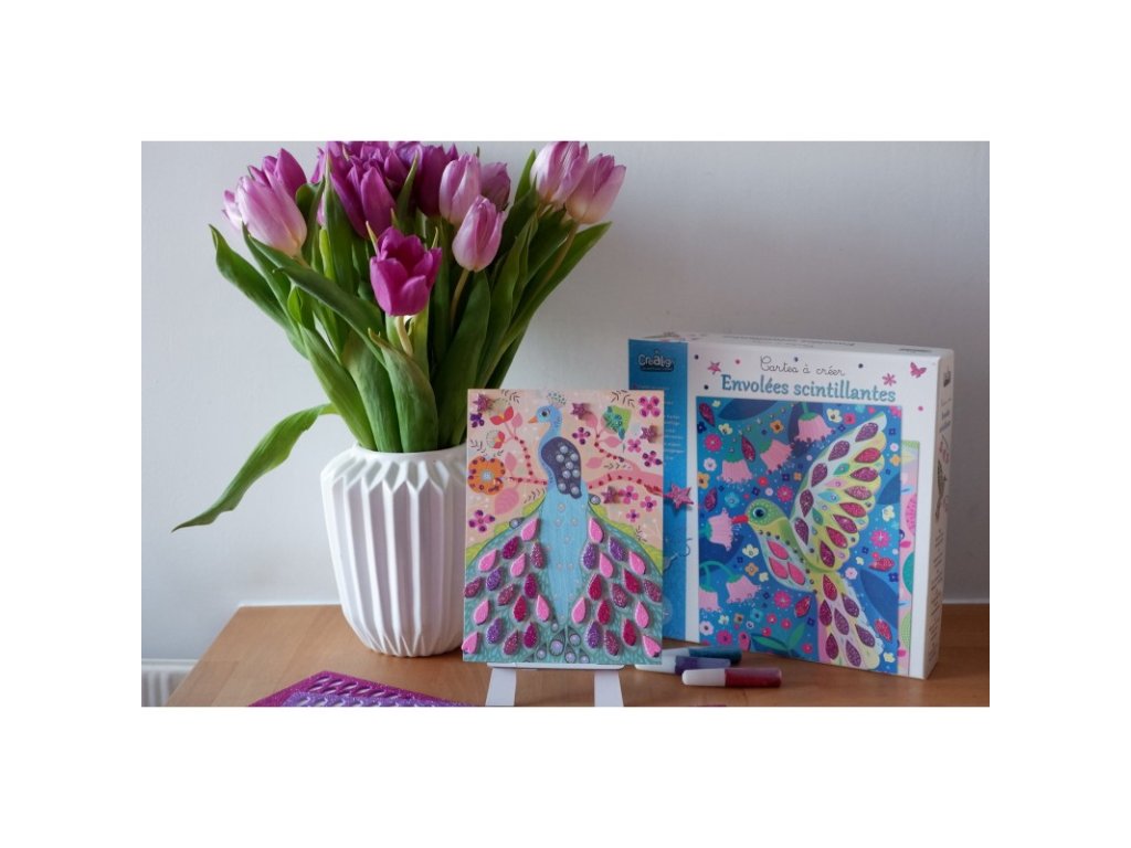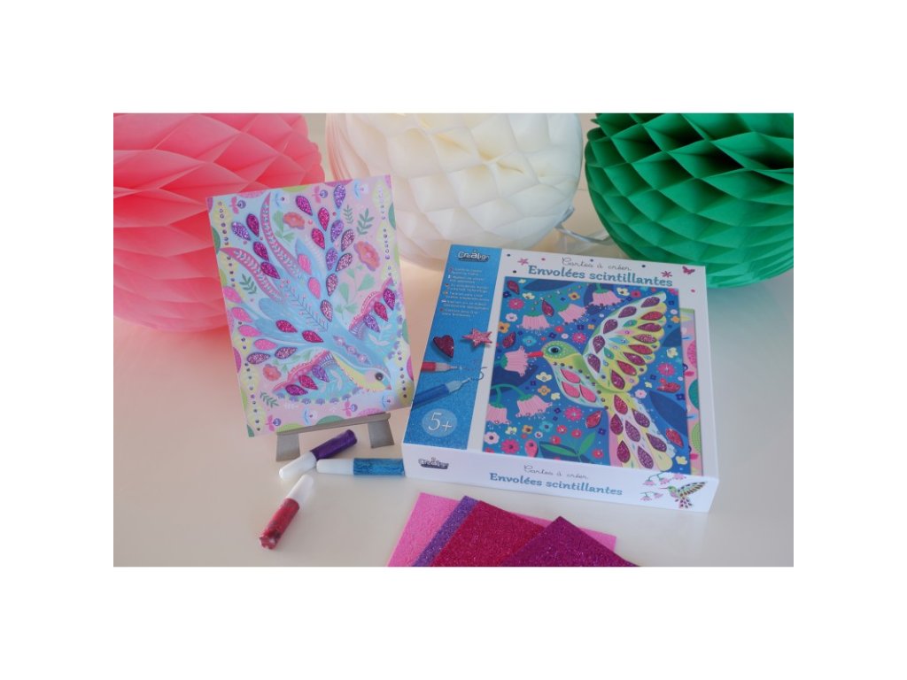Tvorenie je prehľadné a motivujúce: dieťa si vyberie obrázok, nalepí trblietavé tvary na vybrané plochy a trblietkami zvýrazní detaily (perie, krídla, pozadie). Hotové obrázky sa dajú postaviť na skladací stojan, takže z nich vznikne aj pekná dekorácia do izby alebo vlastnoručne vyrobený darček.