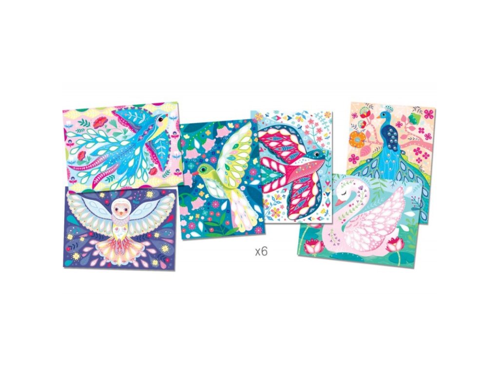 čo dieťa vytvorí: 6 trblietavých obrázkov (vtáky)
