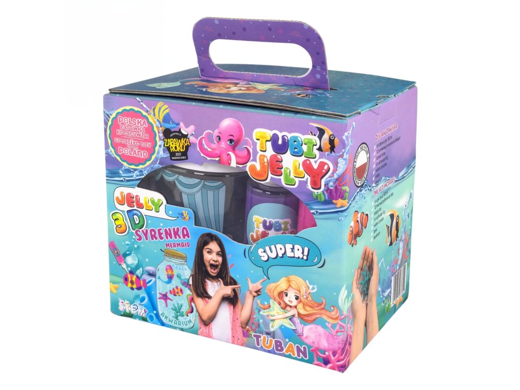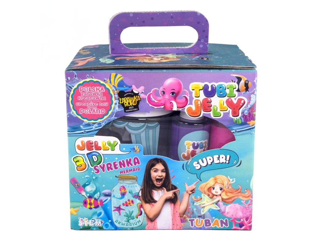 Tubi Jelly Kreatívny set s akváriom XL Morská panna Vytvorte si 3D gélové figúrky Tubi Jelly set je jedinečná tvorivá sada na tvorbu trojrozmerných figúrok. Set XL obsahuje až 6 farebných gélov. Súčasťou sú taktiež šablóny na kreslenie s motívmi morských panien. Po vyplnení šablóny gélmi ju ponoríte do rozpusteného aktivátora a vaša postavička sa premení na svoju trojrozmernú verziu. Vďaka priloženej prázdnej fólii si deti môžu nakresliť a vytvoriť čokoľvek im napadne. Vytvorené figúrky a tvary môžete umiestniť do priloženého akvária, ktoré naplníte vodnými kryštálmi a vytvoríte si tak svoj vlastný malý svet fantázie.Sada obsahuje:tekutý gél 150 ml v 6 farbách,tematické šablóny,6 x 5 g aktivátora,vodné kryštály,nádobu na prípravu figúrok,akvárium.Ocenená hračka roka 2021 V roku 2021 bol produkt Tubi Jelly ocenený titulom Hračka roka v kategórii kreatívne hračky. Vyskúšajte ho aj vy.Všetky produkty značky Tuban sú vyrobené z kvalitných materiálov, sú bezpečné a netoxické, čo znamená, že sa nemusíte obávať o zdravie svojich detí a môžete mať istotu, že ich čakajú len tie najlepšie zážitky.Dodatočné parametre