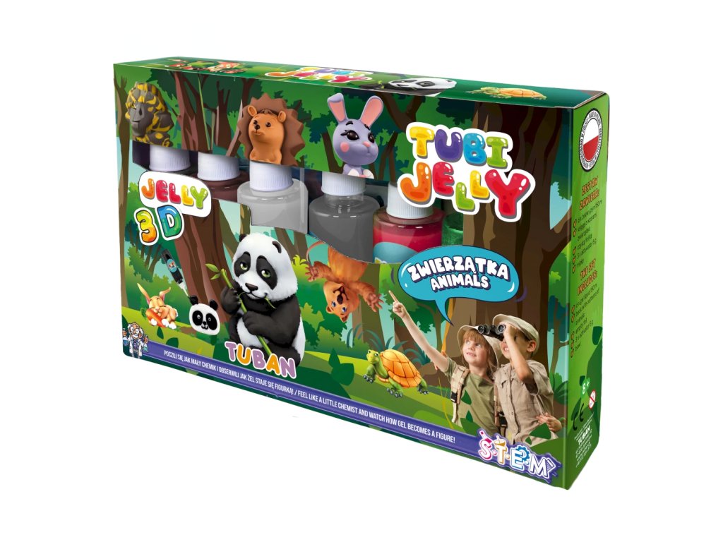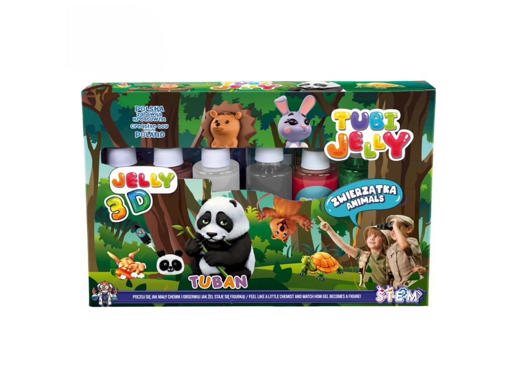 Tubi Jelly Kreatívny set XL Zvieratká Vytvorte si 3D gélové figúrky Tubi Jelly set je jedinečná tvorivá sada na tvorbu trojrozmerných figúrok. Set XL obsahuje až 6 farebných gélov. Súčasťou sú taktiež šablóny na kreslenie s motívmi zvierat. Po vyplnení šablóny gélmi ju ponoríte do rozpusteného aktivátora a vaša postavička sa premení na svoju trojrozmernú verziu. Vďaka priloženej prázdnej fólii si deti môžu nakresliť a vytvoriť čokoľvek im napadne.Sada obsahuje:tekutý gél 150 ml v 6 farbách,tematické šablóny,3 x 5 g aktivátora,nádobu na prípravu figúrok.Ocenená hračka roka 2021 V roku 2021 bol produkt Tubi Jelly ocenený titulom Hračka roka v kategórii kreatívne hračky. Vyskúšajte ho aj vy.Všetky produkty značky Tuban sú vyrobené z kvalitných materiálov, sú bezpečné a netoxické, čo znamená, že sa nemusíte obávať o zdravie svojich detí a môžete mať istotu, že ich čakajú len tie najlepšie zážitky.Dodatočné parametre