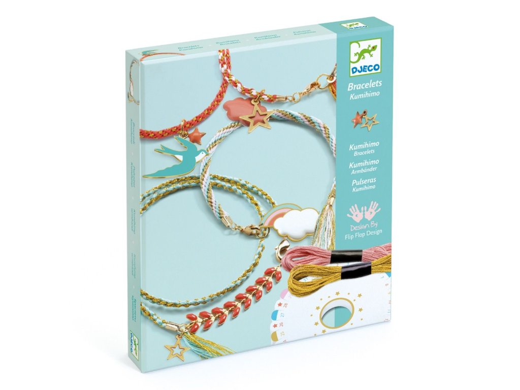 Výroba náramkov je tvorivá sada, s ktorou si deti vyrobia vlastné šperky pomocou tradičnej japonskej techniky kumihimo (zapletanie šnúrok do vzorov). Stačí pripraviť nite, vložiť ich do pletacieho kolieska a postupovať podľa obrázkového návodu – krok po kroku vznikne pevný a krásne pravidelný náramok.