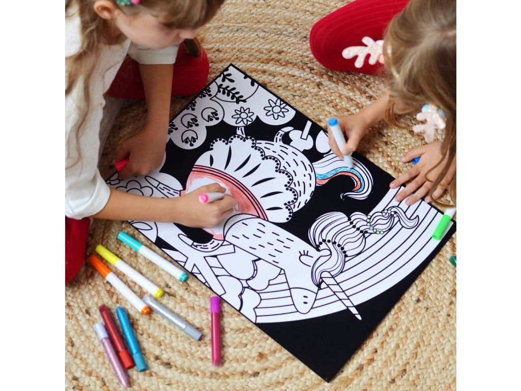 Zamatové maľovanie Jednorožec Kreatívna sada obsahuje tiež 8 fixiek, 8 trblietavých gélov Jedinečná maxi zamatová omaľovánka Jednorožec od Tookyland umožní deťom vytvoriť si pestrofarebné umelecké dielo na stenu. Kreatívna sada totiž obsahuje jednu veľkú zamatovú omaľovánku o veľkosti 57 cm x 35 cm, ale aj 8 zmývateľných fixiek a 8 trblietavých gélov v tube. Vďaka tomu si každé dieťa vyfarbí obrázok úplne inak a na konci tak vznikne jedinečné umelecké dielo.Deti si rozvíjajú grafomotoriku Tenká čierna zamatová vrstva pomáha deťom, aby sa držali kontúr obrázku a nepreťahovali. Cvičia si tak svoju grafomotoriku, dávajú priechod svojej kreativite, zlepšujú si sústredenie, prebúdzajú v sebe záujem o umenie a výtvarné činnosti. Kreatívne sady pre deti od Tookyland sú veľmi nápadité a kvalitne spracované. Zamatové omaľovánky sú skvelé ako malý darček pre deti.Dodatočné parametre