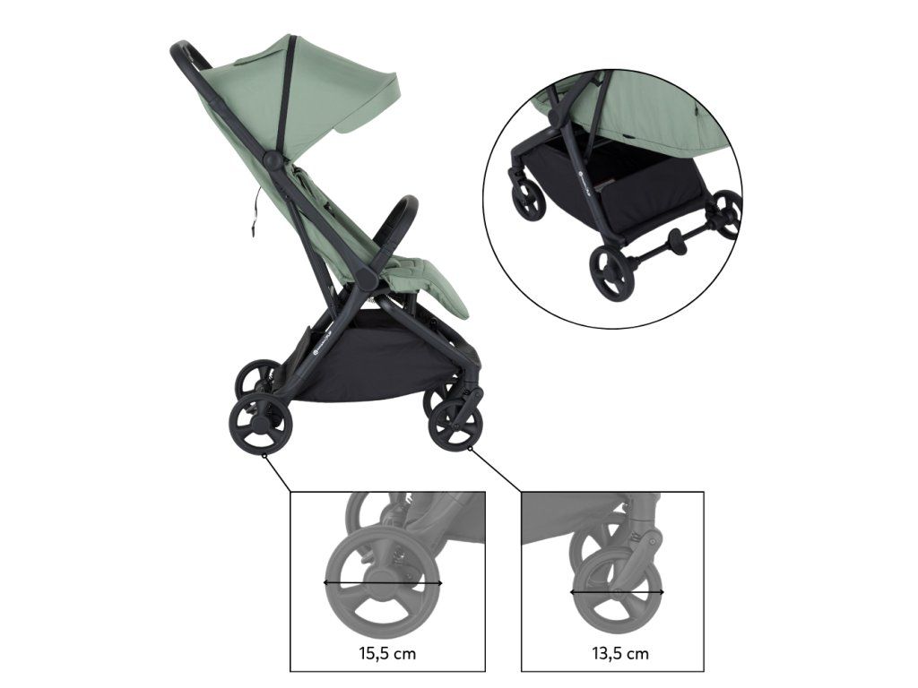 Odpružené PU kolesá predné s možnosťou otáčania o 360° (predné 13,5 cm, zadné 15,2 cm) zabezpečia plynulý pohyb mestom aj v miernom teréne.
