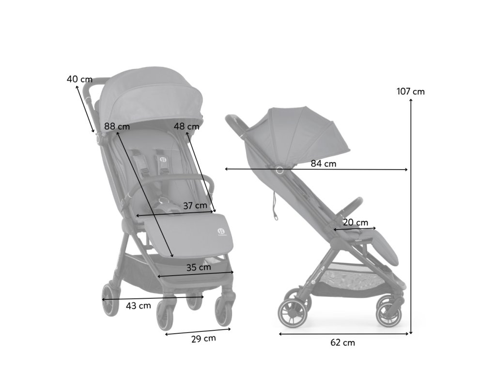 - Rozmery rozloženého kočíka: 84 cm (dĺžka od predného kolieska k rukoväti) × 43 cm (šírka) × 107 cm (výška)