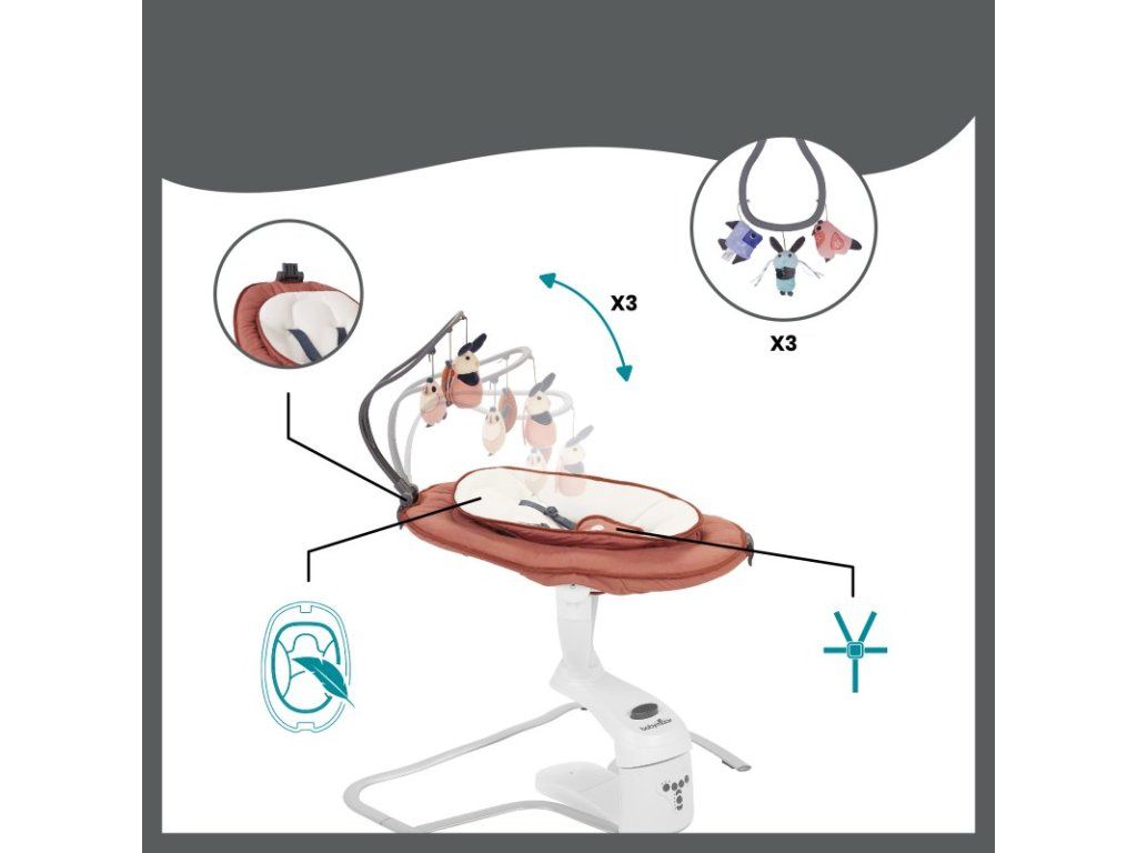 - nastaviteľná doba hojdania (10-20-30 minút) a nastaviteľná hlasitosť