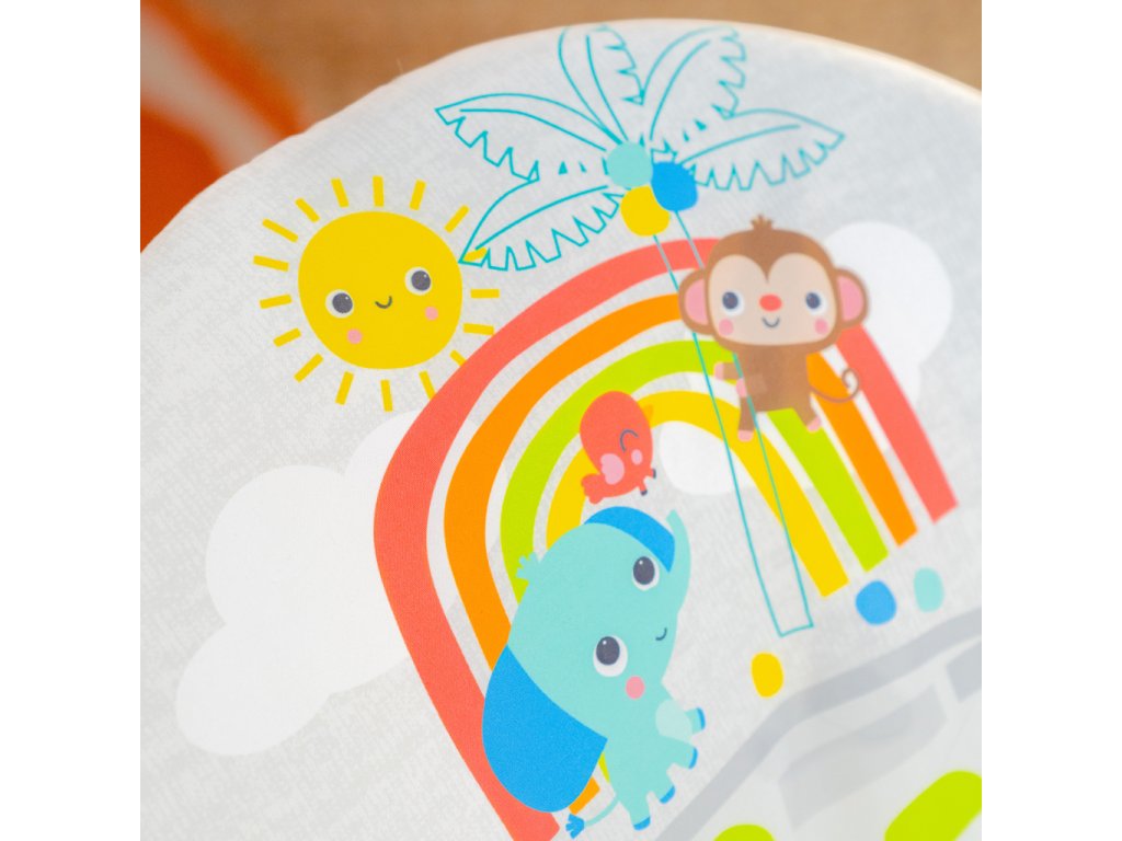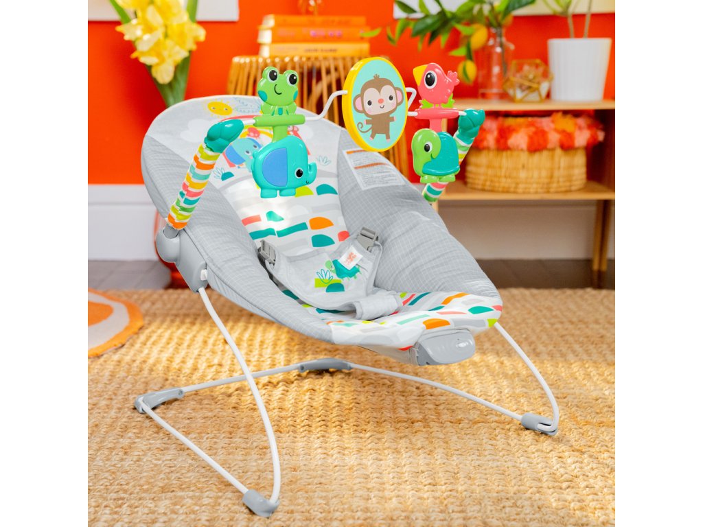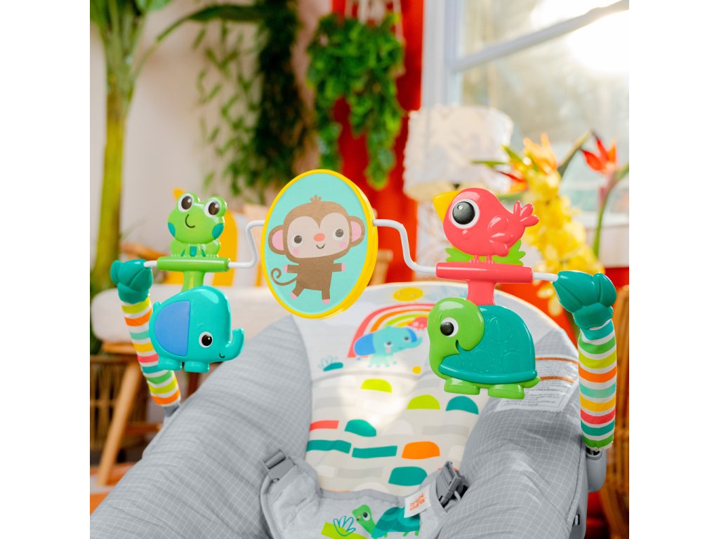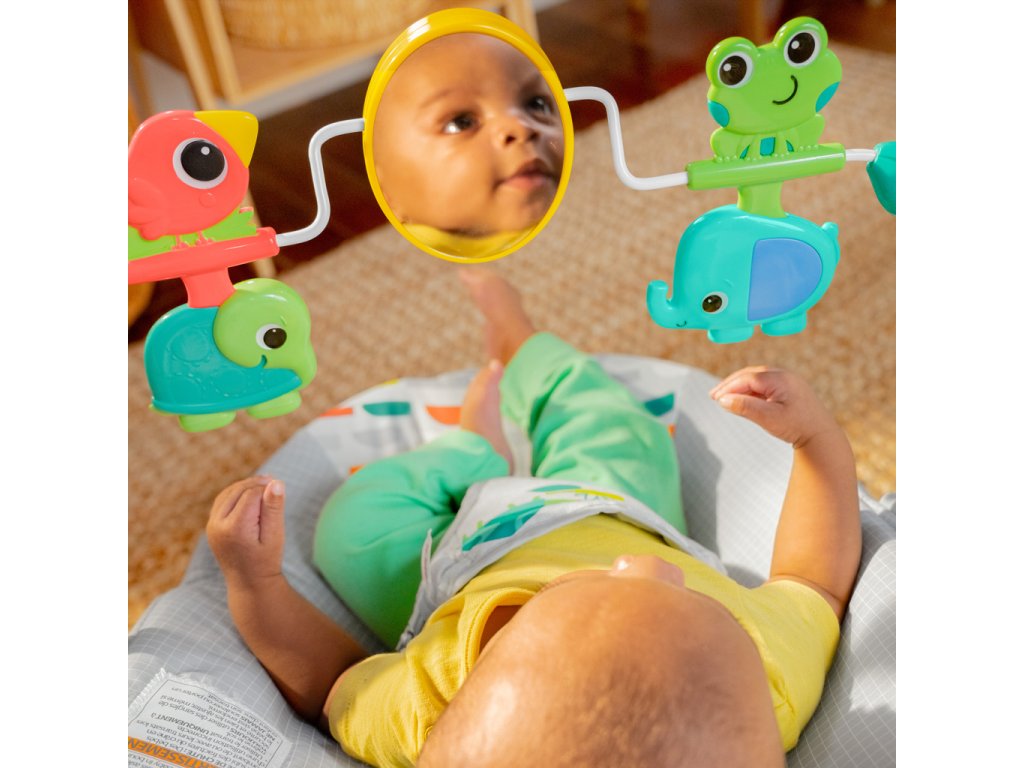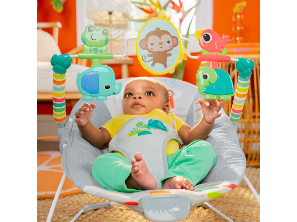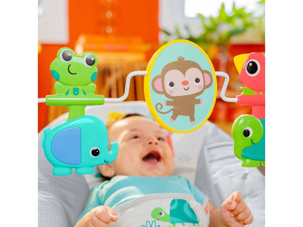 Premeňte izbičku na raj s Vibračným detským lehátkom Playful Paradise od Bright Starts.Toto pohupujúce lehátko pomáha vášmu zvedavému dieťatku hrať sa a precvičovať motorické zručnosti. Nemotorná opička a priatelia vykúzlia Vášmu dieťatku úsmev na perách. Môže sa natiahnuť k netopierovi a roztočiť hračky visiace zhora. Na druhej strane opičky je zrkadielko bezpečné pre detičky slúžiace na predstavenie vlastného odrazu.