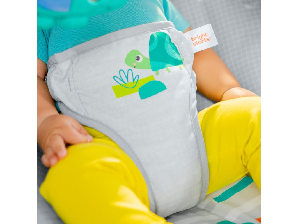 Hlboké pohodlné sedadlo, protišmykové nožičky a 3-bodové bezpečnostné pásy robia z tohto detského lehátka bezpečné miesto na hranie.