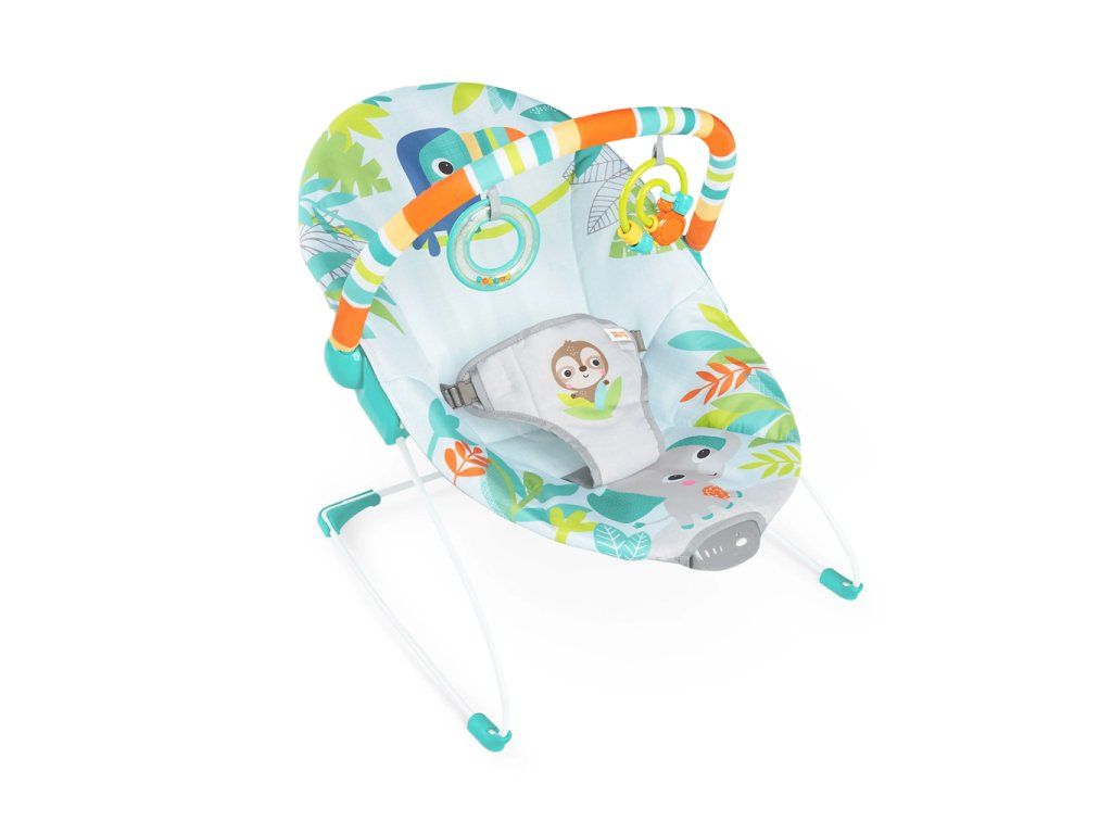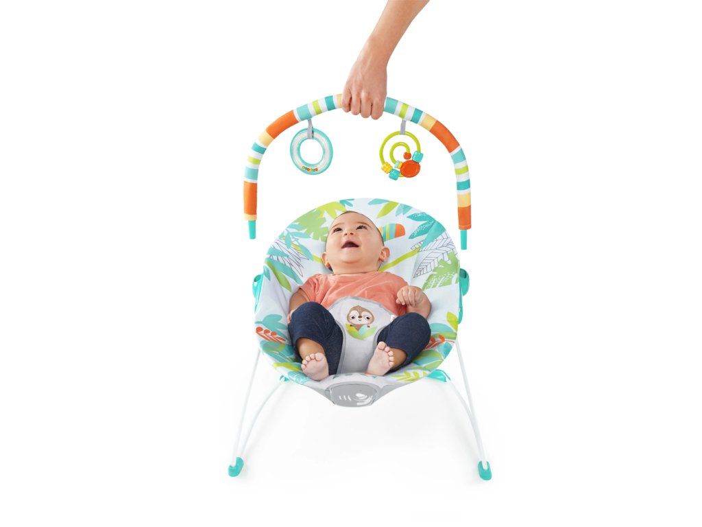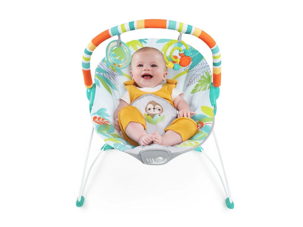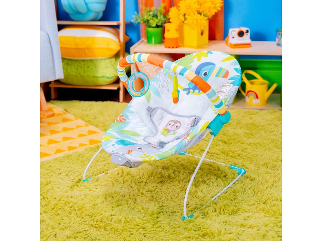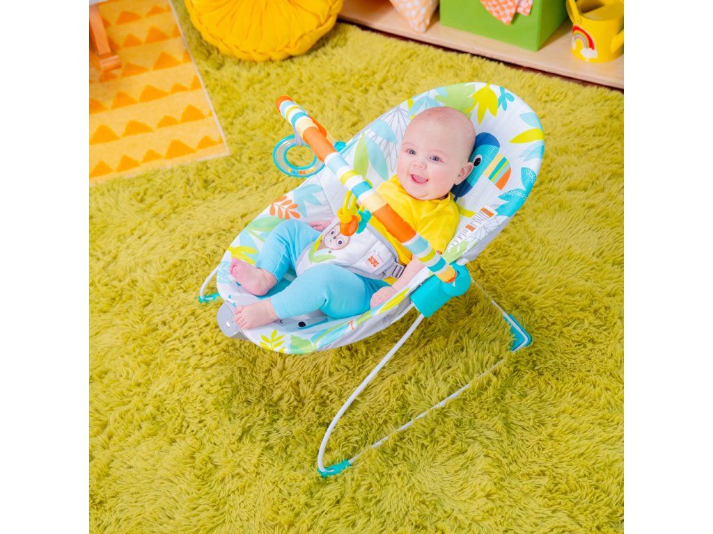 Vibračné lehátko Rainforest Vibes od Bright Starts je tým najdivokejším miestom na sedenie a hranie! Pripravte sa na široké úsmevy, keď sa vaše bábätko začne naťahovať za dvoma farebnými hračkami visiacimi zhora. Vaše malé dieťatko si zamiluje klikanie a hrkálku s korálkami.Pohodlne sa usaďte na gauči – vaše bábätko bude v bezpečí a na dohľad v lehátku s protišmykovými nožičkami a trojbodovým bezpečnostným pásom. Keď sa zábava v džungli chýli ku koncu, jemné vibrácie a hlboké mäkké sedadlo vytvoria tropický ostrov pokoja.
