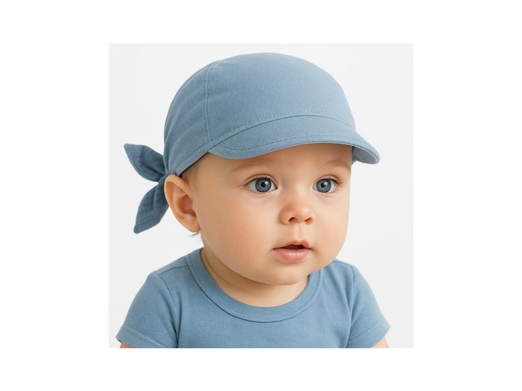 Letná mušelínová šatka so šiltom New Baby. Šatka ochráni hlavičku pred prudkým slnkom a vďaka šiltu, ktorý urobí tieň nespáli tváričku a chráni oči dieťaťa pred slnkom. Veľkosť je regulovateľná pomocou uzlíkov.