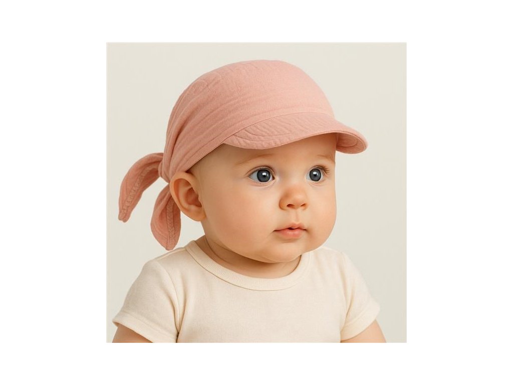 Letná mušelínová šatka so šiltom New Baby. Šatka ochráni hlavičku pred prudkým slnkom a vďaka šiltu, ktorý urobí tieň nespáli tváričku a chráni oči dieťaťa pred slnkom. Veľkosť je regulovateľná pomocou uzlíkov.