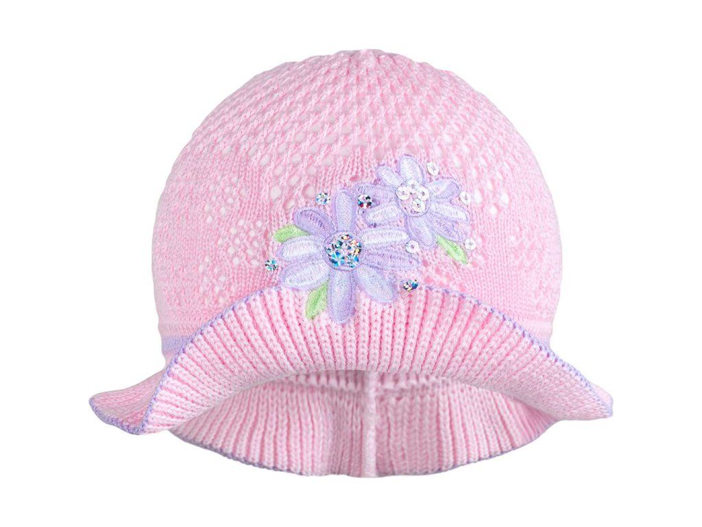 Jarný pletený klobúčik New Baby. Klobúčik zdobí obrázok kvietkov a farebný lem. Zloženie: 100% bavlna. Materiál je pružný. Obvod okolo hlavičky cca 40-50 cm.Dodatočné parametre