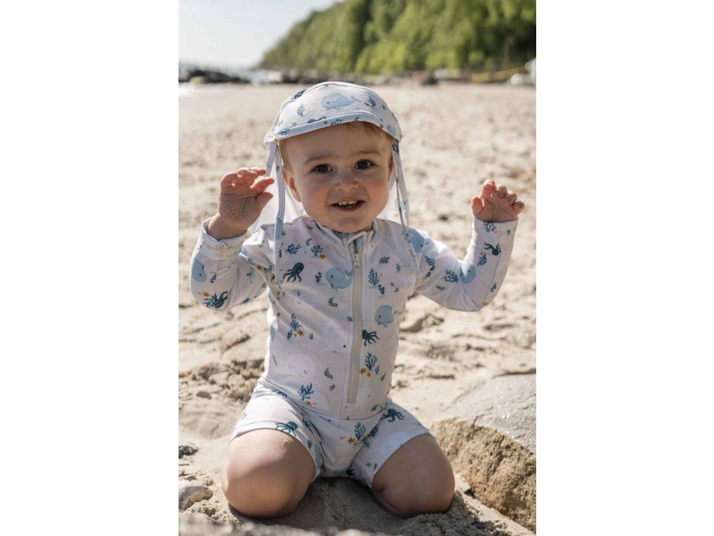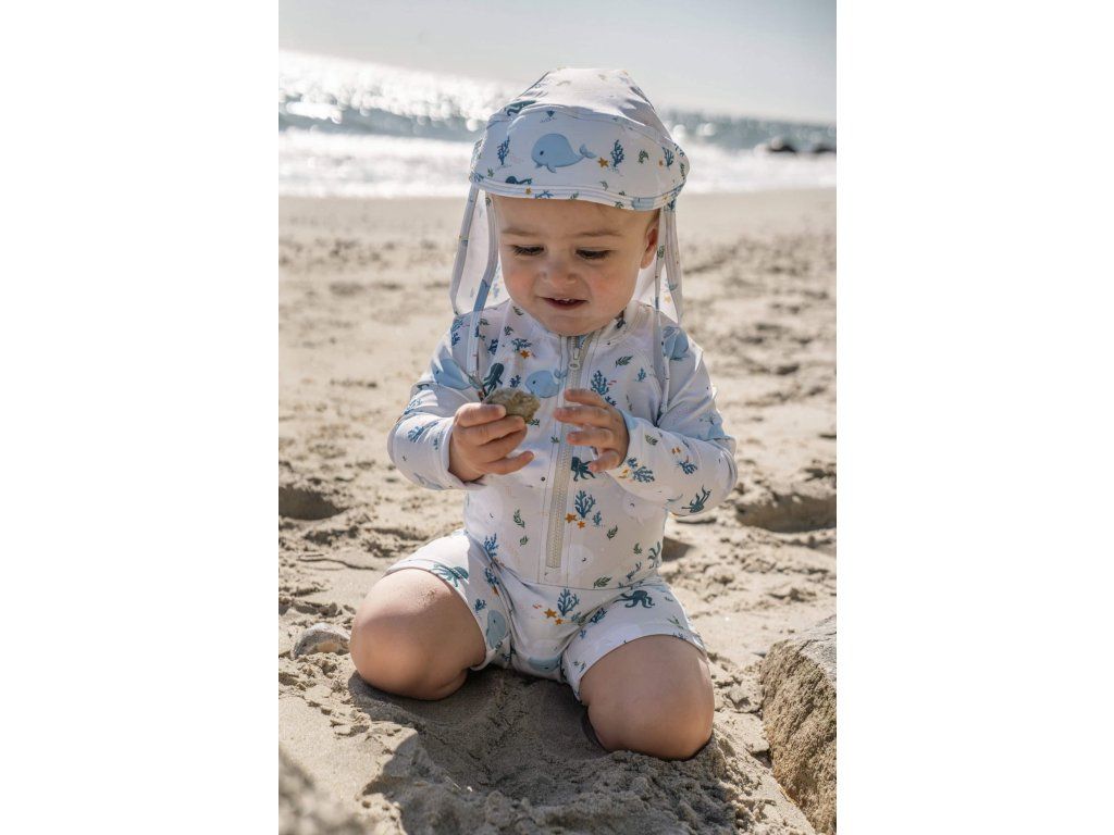 Klobúčik sa dá upevniť šnúrkou pod bradou, takže dobre drží na mieste aj počas hry. Odolný materiál sa ľahko čistí vlhkou handričkou a rýchlo schne. Dostupný je v dvoch krásnych, ručne kreslených letných vzoroch, vďaka čomu je ideálnym spoločníkom na súš aj do vody.