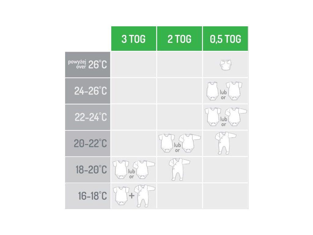 Teplotný koeficient TOG - udáva mieru zateplenie spacieho vaku. Čím je koeficient vyšší, tým je vrstva zateplenie, a teda hrejivosť vaku intenzívnejšia. 0,5 TOG označuje tenký letný spací vak / 3 TOG celoročný - zimný.