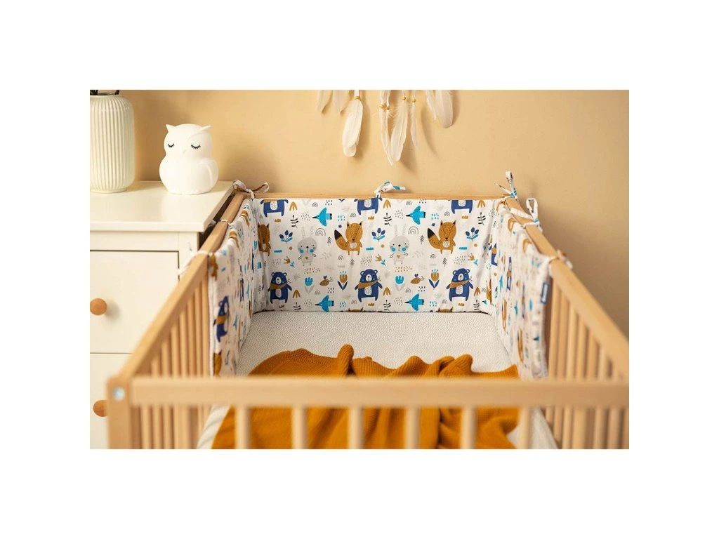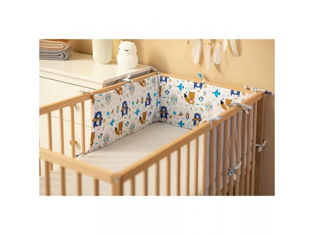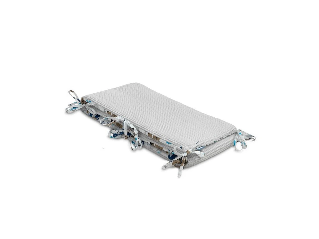 Tenký mantinel do postieľky od Sensillo je alternatívou k veľkým a ťažkým mantinelom bežne používaným v detských postieľkach. Tenká antialergická výplň poskytuje dostatočnú izoláciu, chráni dieťa pred zranením pri pohybe po postieľke a predovšetkým je bezpečná a minimalizuje riziko udusenia. Jedinečný vzhľad nárazníka tvorí kombinácia dvoch materiálov. Jedna strana je vyrobená z mäkkej a na dotyk príjemnej bavlny s vaflovou štruktúrou a druhá strana je vyrobená z bavlny s farebnou potlačou. Obe látky majú certifikát Oeko-Tex. Každých 30 cm sú všité pásiky, ktoré pre upevnenie zaisťujú držanie mantinelu v správnej polohe. Mantinel má nielen praktickú funkciu, ale je aj ozdobou detskej izby. Bol navrhnutý pre postieľku s rozmermi 120x60 cm.