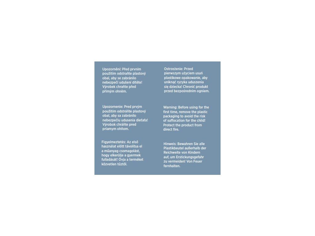 UPOZORNENIE! Pred prvým použitím odstráňte plastový obal, aby sa zabránilo nebezpečiu udusenia dieťaťa! Výrobok chráňte pred priamym ohňom.