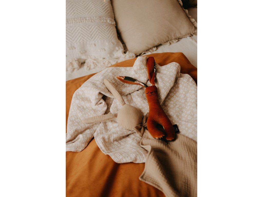 Premýšľate, ako potešiť novopečenú mamičku a jej dieťa niečím originálnym? S produktom Môj prvý zajačik neurobíte chybu. Vďaka svojmu krásnemu dizajnu poslúži nielen ako dekorácia a ľahko ho zladíte s ostatnými výrobkami T-TOMI. Zajačik bol navrhnutý tak, aby ho malé detské rúčky mohli ľahko uchopiť. Môj prvý zajačik je z jednej strany vyrobený zo 100 % bavlny a z druhej strany z príjemného polyesteru (velvetu).materiál 100 % dizajnová bavlna + nadýchaný polyester (velvet)