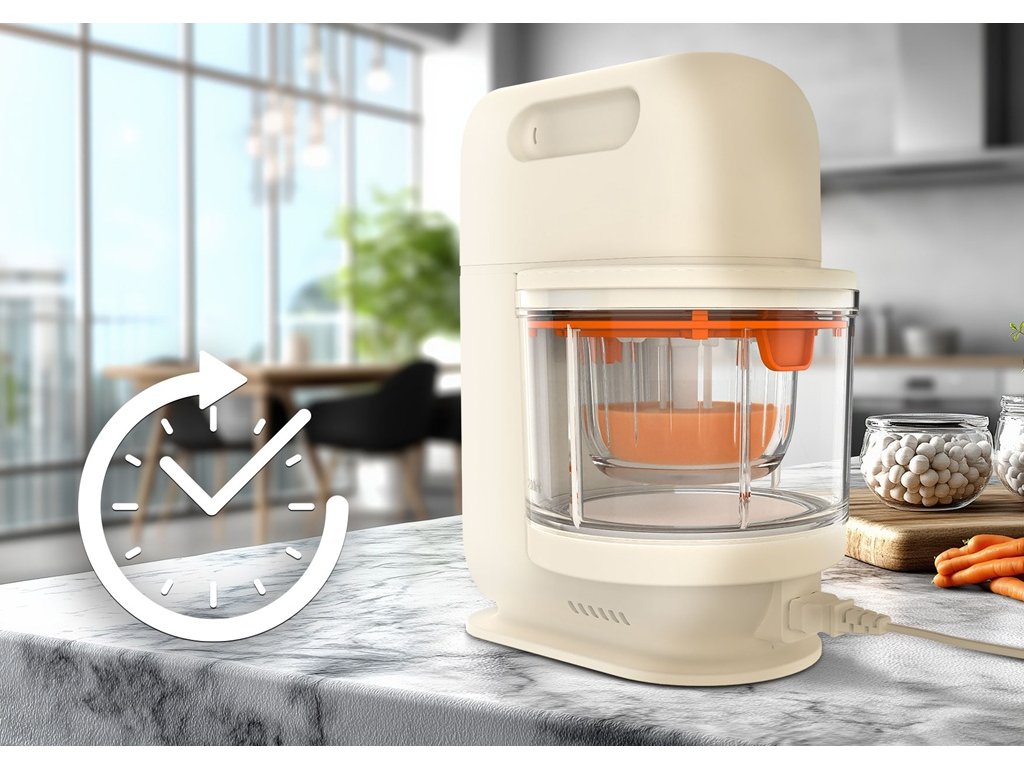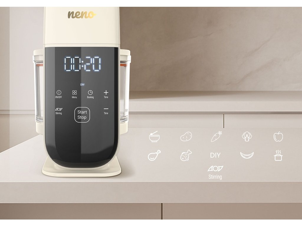 S Neno Oro sa varenie stáva jednoduchým, rýchlym a bez neporiadku! Tento multifunkčný prístroj kombinuje varenie v pare a automatické mixovanie, vďaka čomu zachováva cenné živiny a šetrí riad v kuchyni. Všetko, čo potrebujete na prípravu jedál pre vaše dieťa – v jednom kompaktnom zariadení.Vlastnosti: