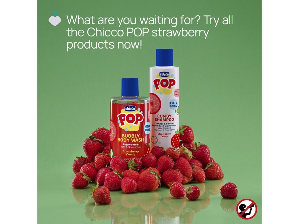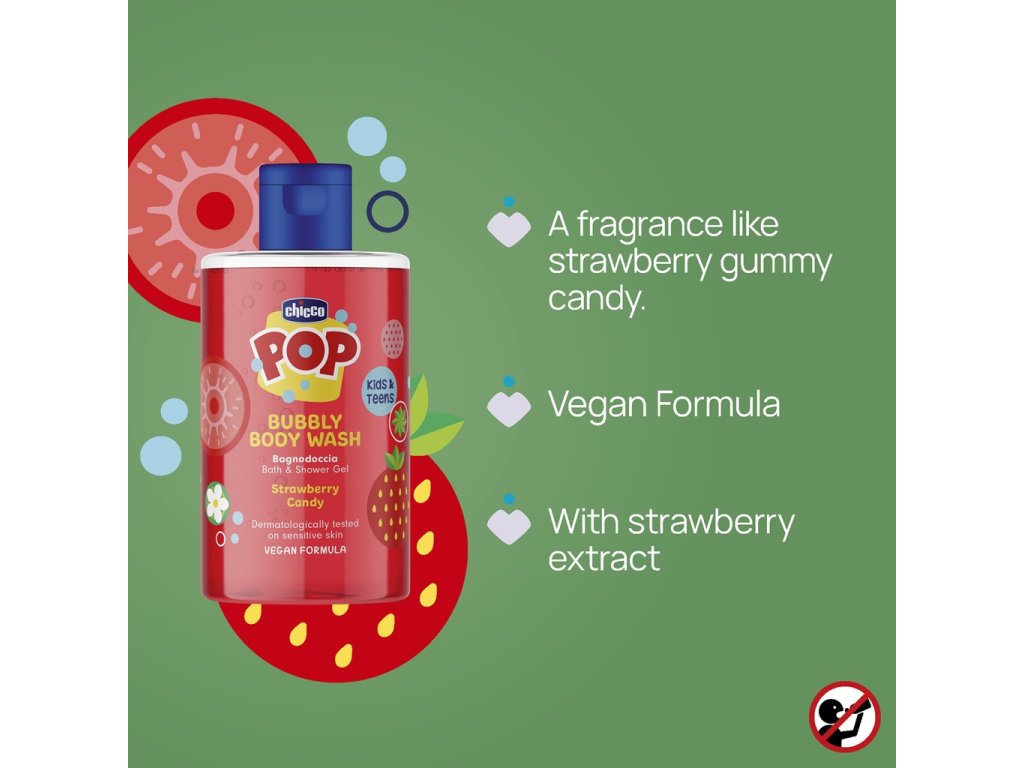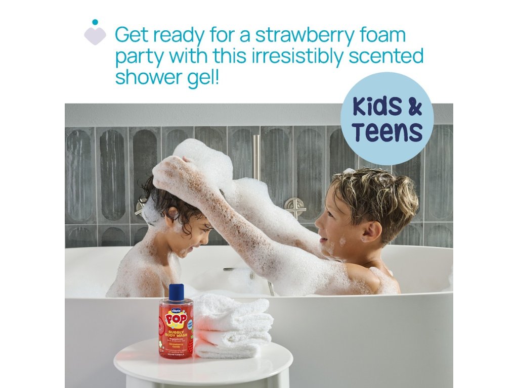 Chicco Pop je kozmetická rada navrhnutá tak, aby bol čas kúpania vzrušujúci a zábavný pre všetky deti.Sprchový gél s neodolateľnou vôňou jahodových cukríkov premení každé kúpanie na chvíle plné radosti a osvieženia. Jemná a penivá receptúra je ideálna pre deti a tínedžerov, ktorí si chcú užiť starostlivosť o pokožku hravým spôsobom.