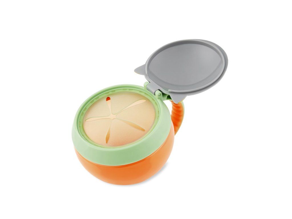 Šikovný nápad na cesty. Nádoba má viečko, ktoré po otvorení drží, pred vysypaním obsahu ho chránia pružné lamely, ktoré pustia detskú ručičku dovnútra, ale nepustia desiatu von. Nádoba je priehľadná, aby sa mohla zavčasu doplniť. Na boku je praktické uško v detskom rozmere, pomocou ktorého možno nádobu pripevniť aj na kočík či tašku. 0% BPA, 0% PVC, bez ftalátov. Obsah: 222 ml. Priemer: 10 cmRozmery produktu: 12 cm x 9,4 cm x 8,8 cm