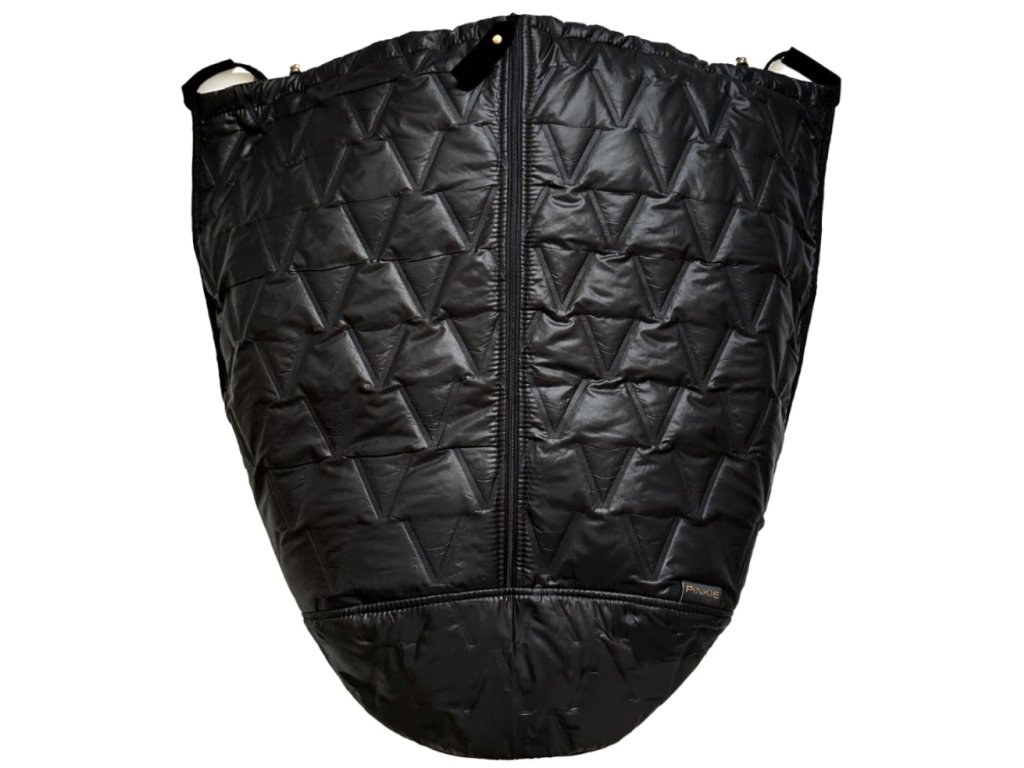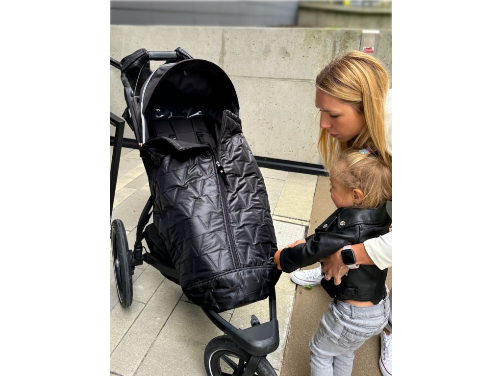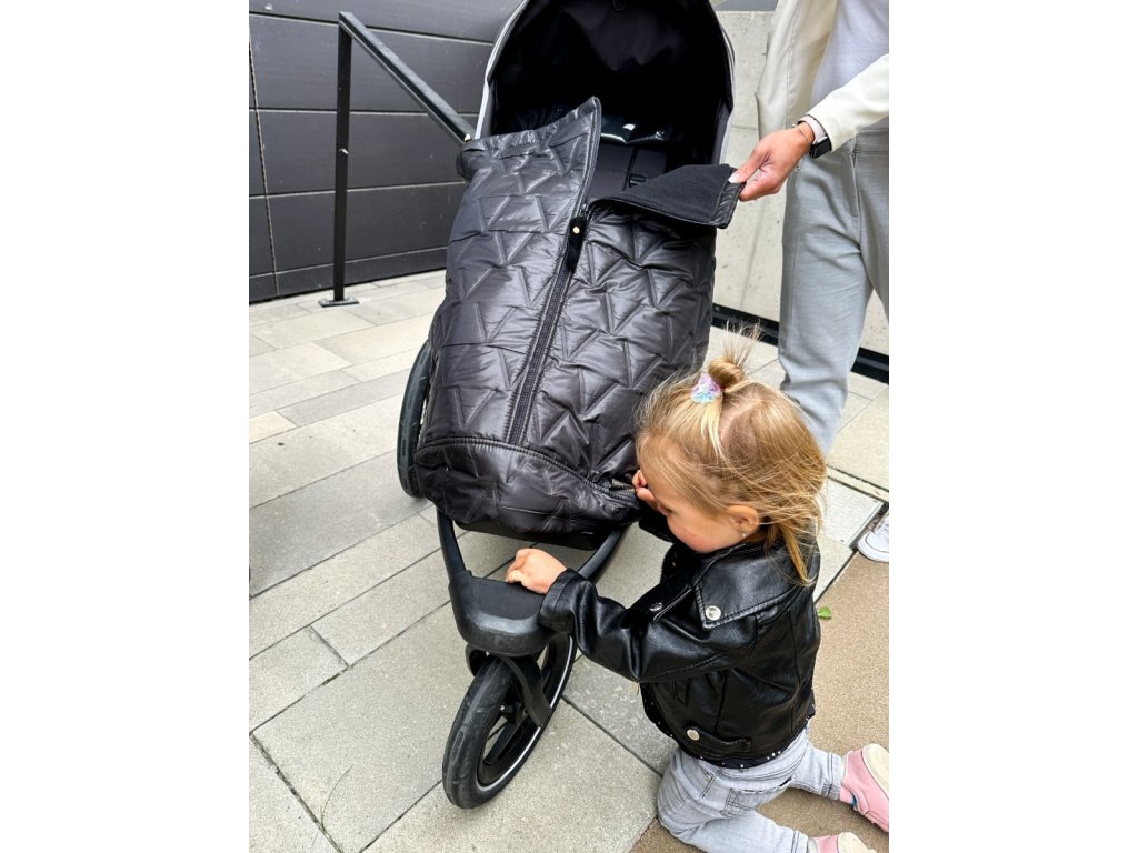 Nasaďte nánožník na kočík (horné pútka ku kľbu búdičky alebo madlu, popruhy s trojzubcom veďte okolo konštrukcie a stiahnite tak, aby nánožník na kočíku pekne držal ), rozopnite stredový zips, zopnite cvoky a ktoré sú na vnútornom oblúku. poupravte tak, by spodná časť nánožníka vytvorila nové dno - priestor na nožičky.