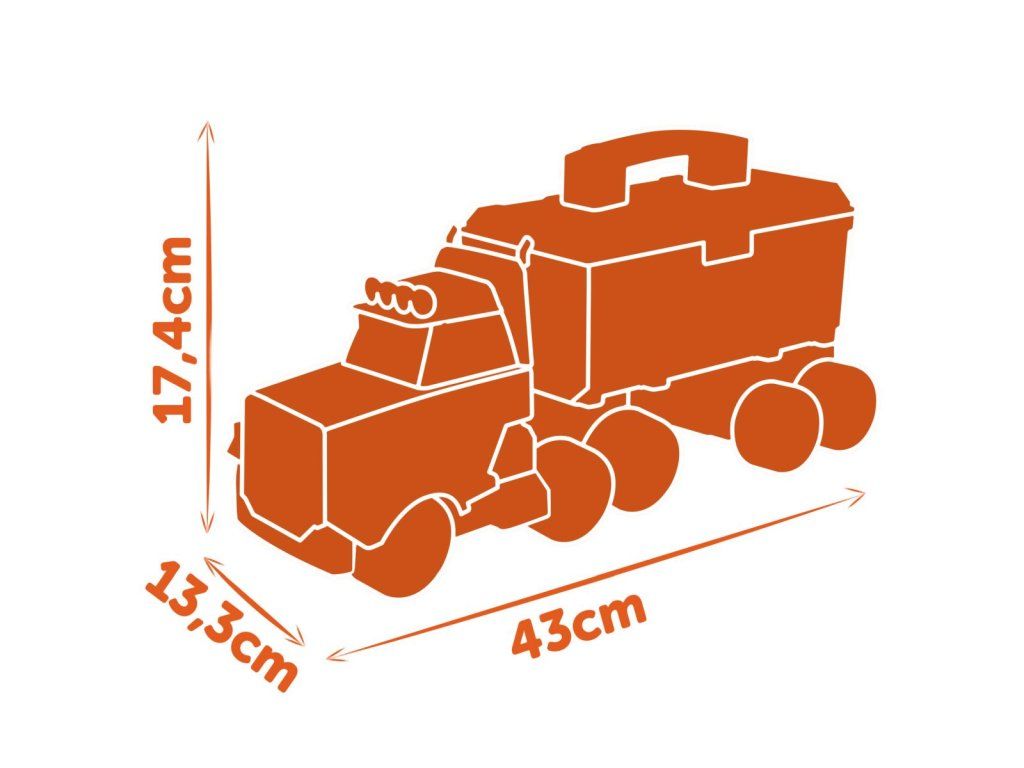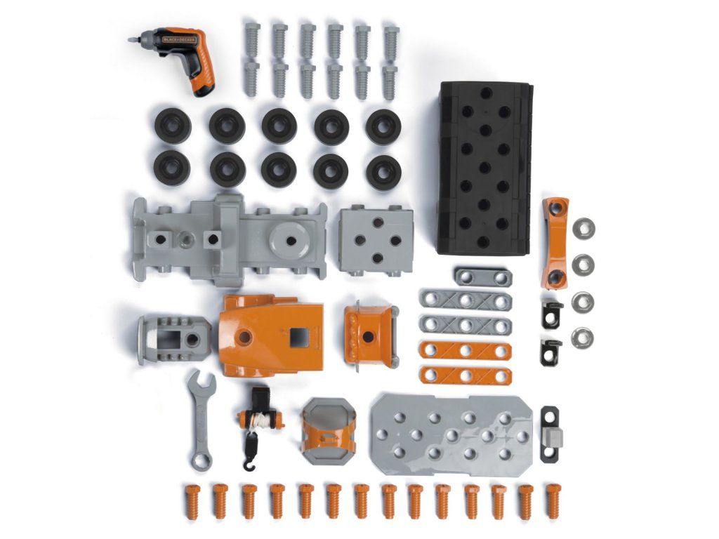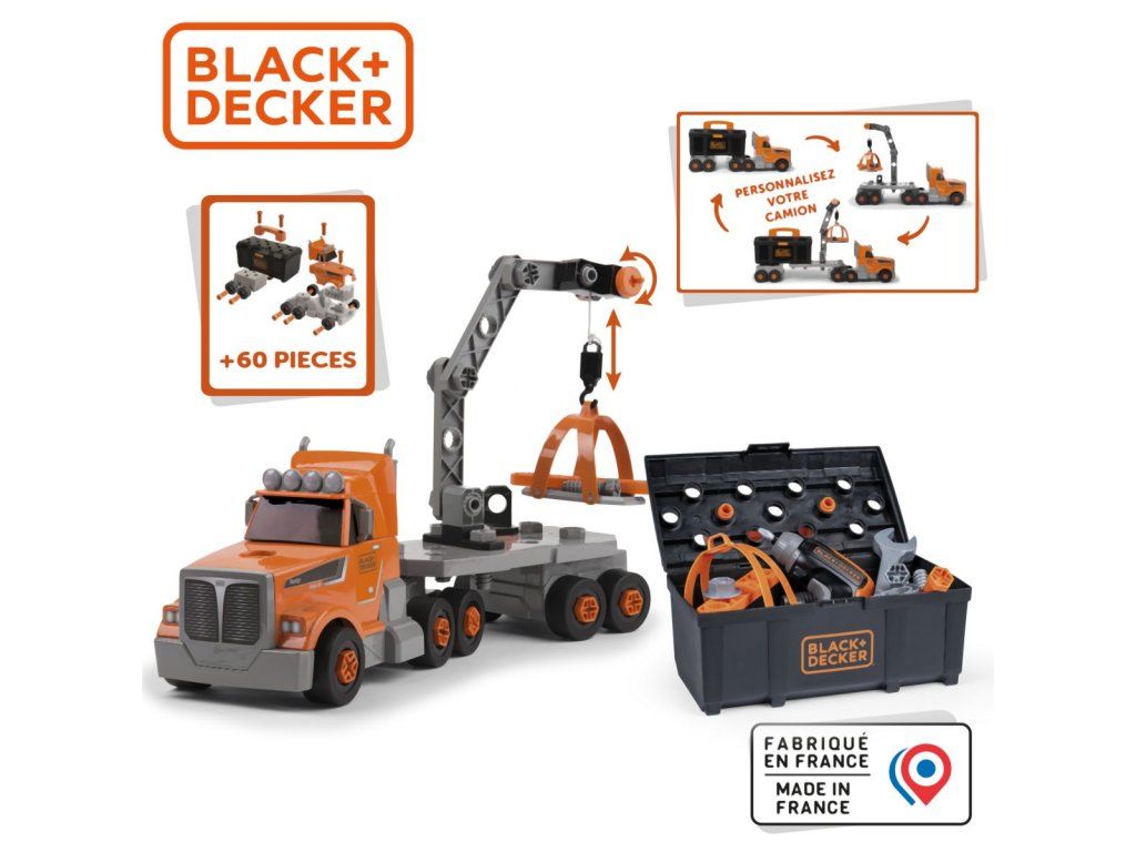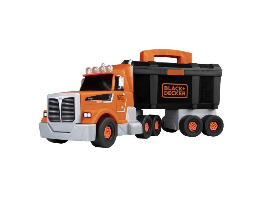 Kamión v licencii Black&Decker s prívesom, ktorý slúži ako praktický box s držadlom na náradie a malou vŕtačkou. Súčasťou sada náradia - skrutkovač, kľúče, skrutky, matice a ďalšie. Veľa stavebných možností, najmä konštrukcia žeriava vďaka cca. 60 ks príslušenstva. Dĺžka kamiónu 43 cm.Dodatočné parametre