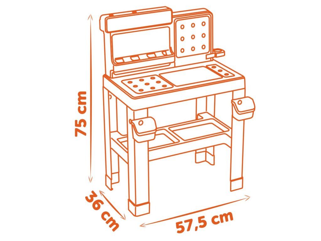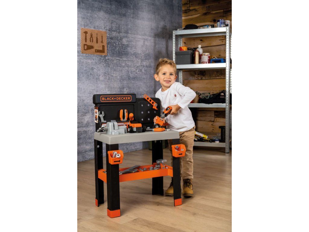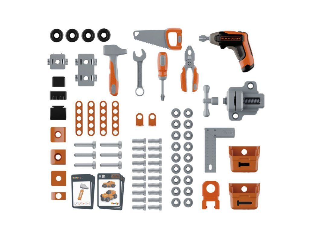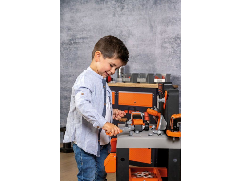 Realistické centrum pracovného stola Smoby Black + Decker s 83 dielmi príslušenstva, 7 nástrojmi a vozidlom. Veľký, robustný pracovný stôl vyzerá ako skutočný otcov pracovný stôl. Veľká pracovná plocha v drevenom designe ponúka dostatok priestoru pre rôzne náradie. Mechanickým akumulátorovým skrutkovačom je možné zo stavebných blokov zoskrutkovať rôzne vozidlá. Vybavenie je doplnené skrutkovou svorkou a posuvným pravítkom. Veľa úložných priehradok na skrutky a klince. So zábavnou zatĺkacou funkciou klincov. Tento výrobok obsahuje minimálne 65 % recyklovaného materiálu. Rozmery produktu (DxŠxV): 36 x 57,5 ??x 75 cm.Dodatočné parametre