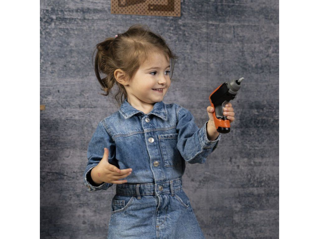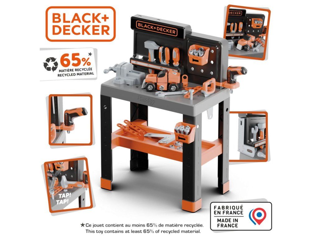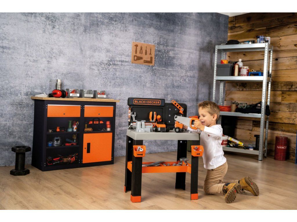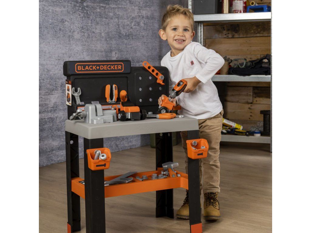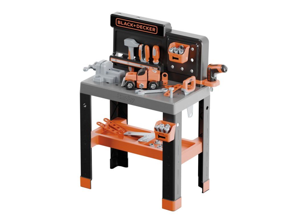 Realistické centrum pracovného stola Smoby Black + Decker s 83 dielmi príslušenstva, 7 nástrojmi a vozidlom. Veľký, robustný pracovný stôl vyzerá ako skutočný otcov pracovný stôl. Veľká pracovná plocha v drevenom designe ponúka dostatok priestoru pre rôzne náradie. Mechanickým akumulátorovým skrutkovačom je možné zo stavebných blokov zoskrutkovať rôzne vozidlá. Vybavenie je doplnené skrutkovou svorkou a posuvným pravítkom. Veľa úložných priehradok na skrutky a klince. So zábavnou zatĺkacou funkciou klincov. Tento výrobok obsahuje minimálne 65 % recyklovaného materiálu. Rozmery produktu (DxŠxV): 36 x 57,5 ??x 75 cm.Dodatočné parametre