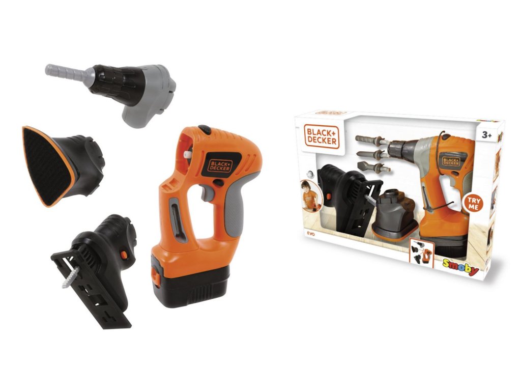Elektronické náradie s gumovou rukoväťou a s 3 vymeniteľnými časťami: vŕtačka, priamočiara píla, rotačná brúska. Rozmery: 20 x 17,50 x 5 cm.Dodatočné parametre