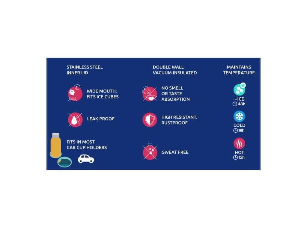 Termoska Quokka Solid z vysoko kvalitnej dvojstennej ocele so spoľahlivým, 100% tesniacim uzáverom udrží váš nápoj podľa potreby teplý či studený. Široké hrdlo umožňuje vloženie kociek ľadu. Termoska udrží teplotu studeného nápoja s ľadom až 48 hodín, studeného nápoja až 18 hodín a teplého nápoja až 12 hodín.