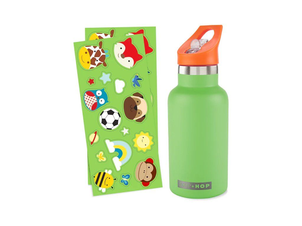 SKIP HOP Fľaša s nálepkami so slamkovým náustkom nerezová zelená 380 ml, 4r+