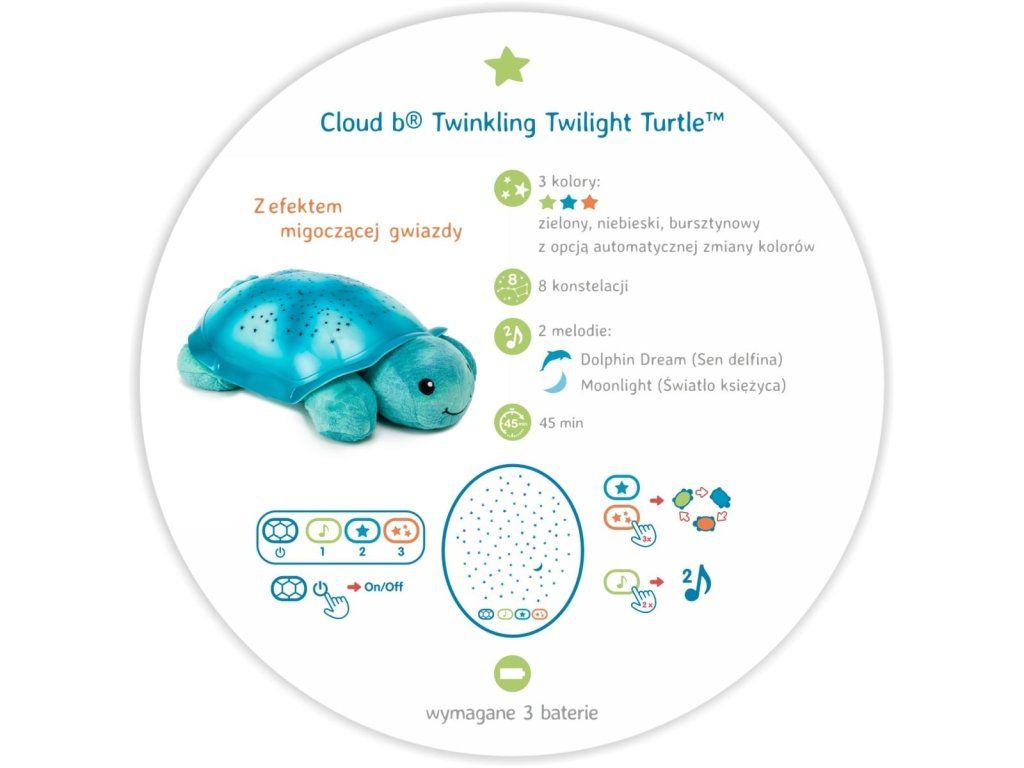 Cloud b® Twinkling Twilight Turtle™ - Nočné svetielko s melódiou, Korytnačka, modrá, 0m+