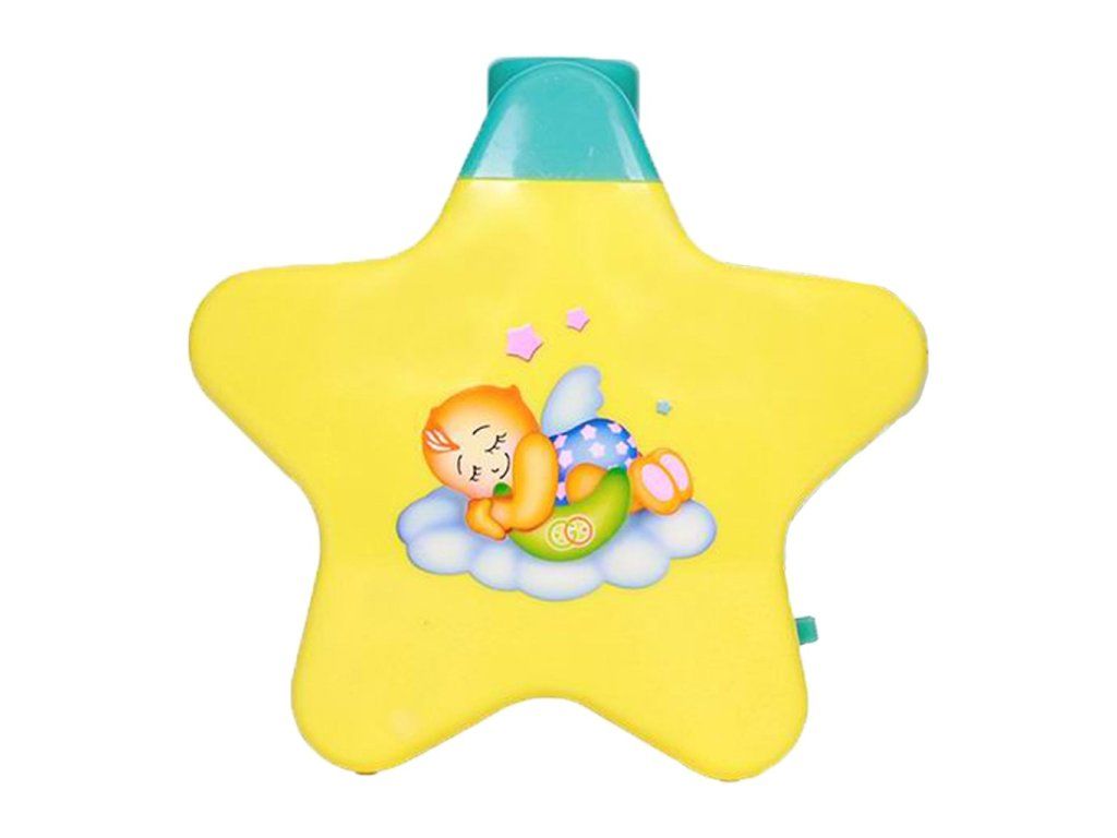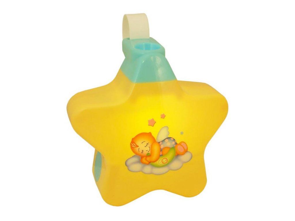 Hudobný projektor pre bábätká. Projektor v tvare hviezdičky premieta na strop krásne obrázky hviezdičiek a medvedíka a hrá 3 uspávanky. Na hviezdičke je tlačidlo pre vypnutie a zapnutie ON / OFF. Poloha tlačidla ON má dve možnosti, ktoré určujú hlasitosť melódií. Projektor má samostatné tlačidlo, ktorým sa zapína hudba a samostatné tlačidlo, ktorým sa zapínajú pohyblivé obrázky. Vyrobené z kvalitného plastu. Určené pre deti od narodenia. Batérie sú súčasťou balenia. Rozmery cca 15x15 cm.