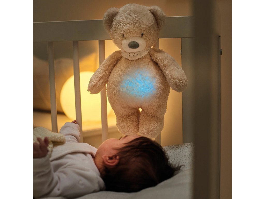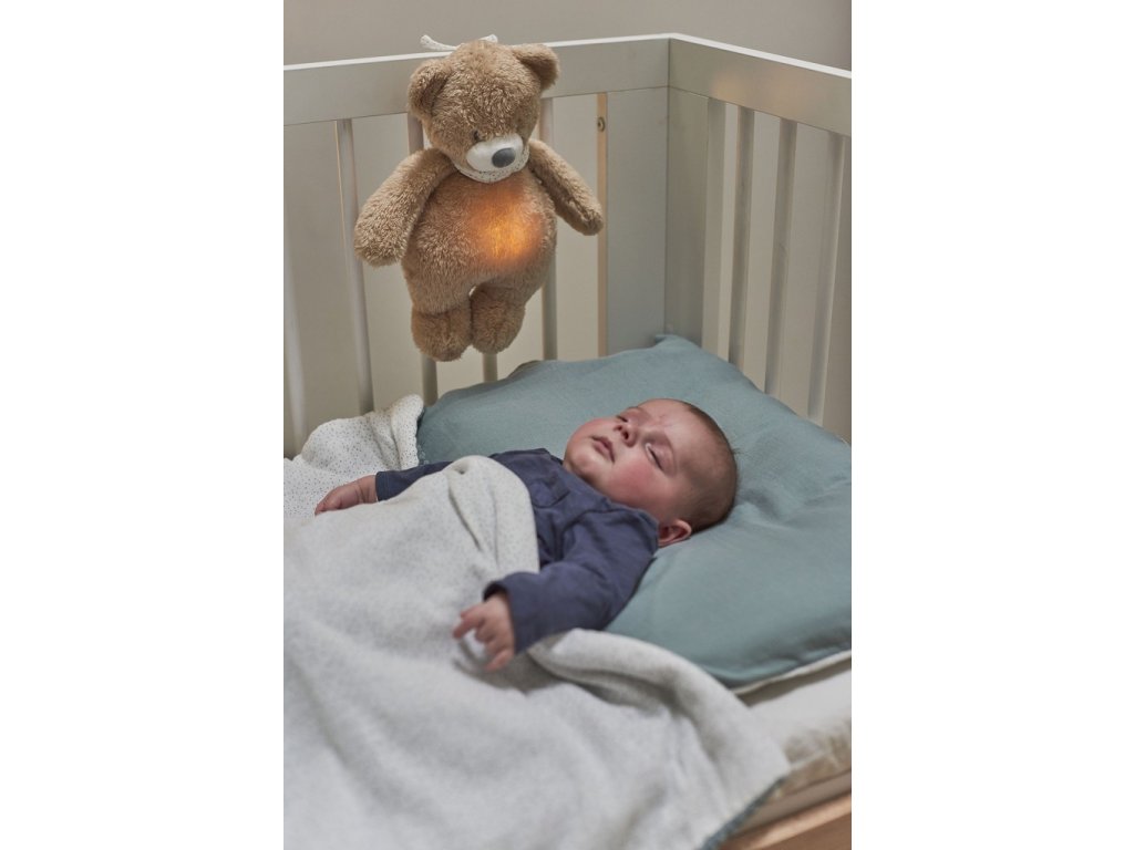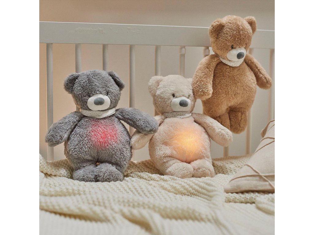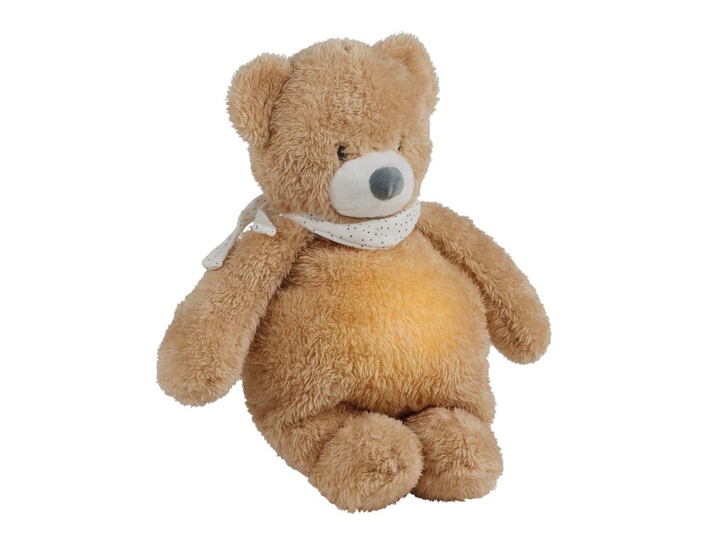 Prítulná plyšová hračka na spanie Nattou v tvare medvedíka s vyšívanou tváričkou a jemným podbradníkom.Medvedík na spanie Nattou je krásnej mäkkej kvality s príjemnou výplňou. Spiaci medvedík má v brušku svetielko, ktoré sa môže meniť medzi siedmimi farbami a zvukom, s bielym šumom, morom, tlkotom srdca a dvoma upokojujúcimi uspávankami, ktoré pomáhajú zabezpečiť pokojný spánok. Zvuky spiaceho medvedíka sa aktivujú automaticky, keď započuje plač dieťaťa a zvuky automaticky prestanú po 15 minútach. Svetlo spiaceho medvedíka vychádza z LED diódy v brušku, takže svetlo je tlmené textíliou zajačika a neprehrieva sa, teda svetlo môže bez problémov svietiť celú noc.