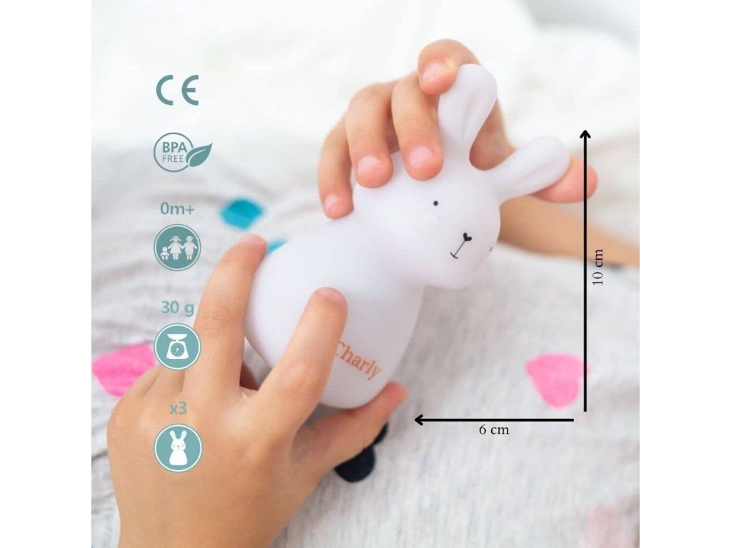 Charlie je dokonalým spoločníkom pre sladké sny. Zajko je malý, ľahký a prispôsobená rúčkam malých detí. Vyžaruje jemné svetlo, vhodné pre oči. Neutralita svetla je veľkou výhodou lampy, pretože vďaka tomu sa dieťa nezobúdza a oči sa neunavujú.