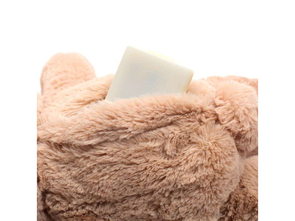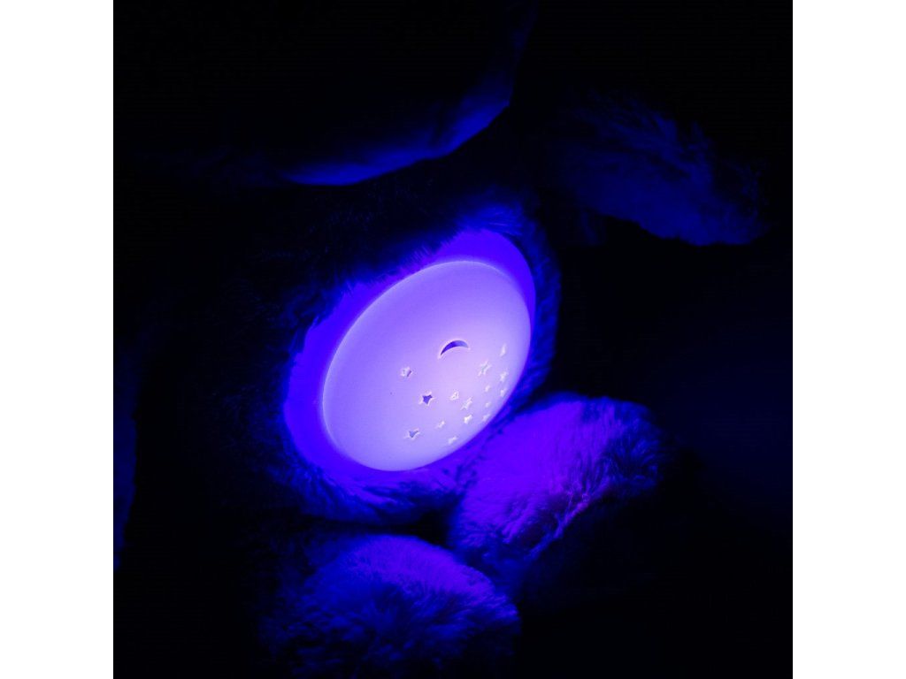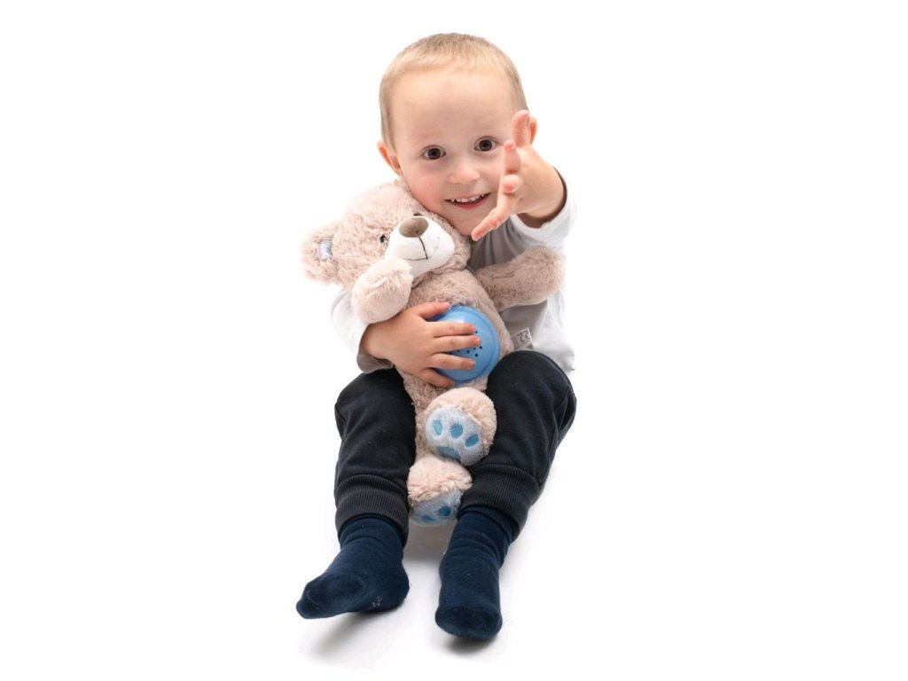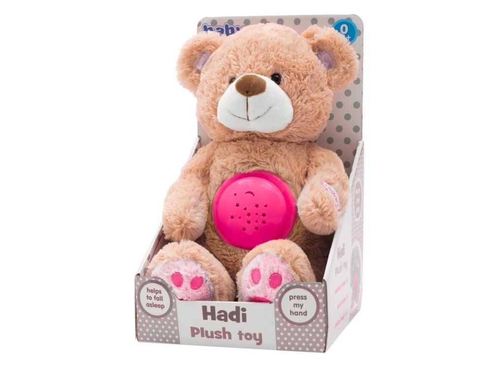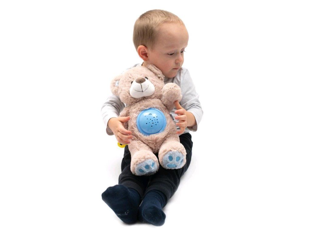 Roztomilý plyšový medvedík s projektorom Baby Mix. Po stlačení tlačidla umiestneného na labke zapnete svetielko, ktoré mení farbu a poslúži ako maličká nočná lampička a zároveň sa sputia jemné melódie. V zadnej časti je umiestnený strojček na batérie. Zapnúť a vypnúť je možné tlačidlom on / off. Batérie sú súčasťou balenia. 3x Typ AA 1,5 V. Hračka je vhodná pre deti od 6 mesiacov. Rozmery: cca 34 cm.
