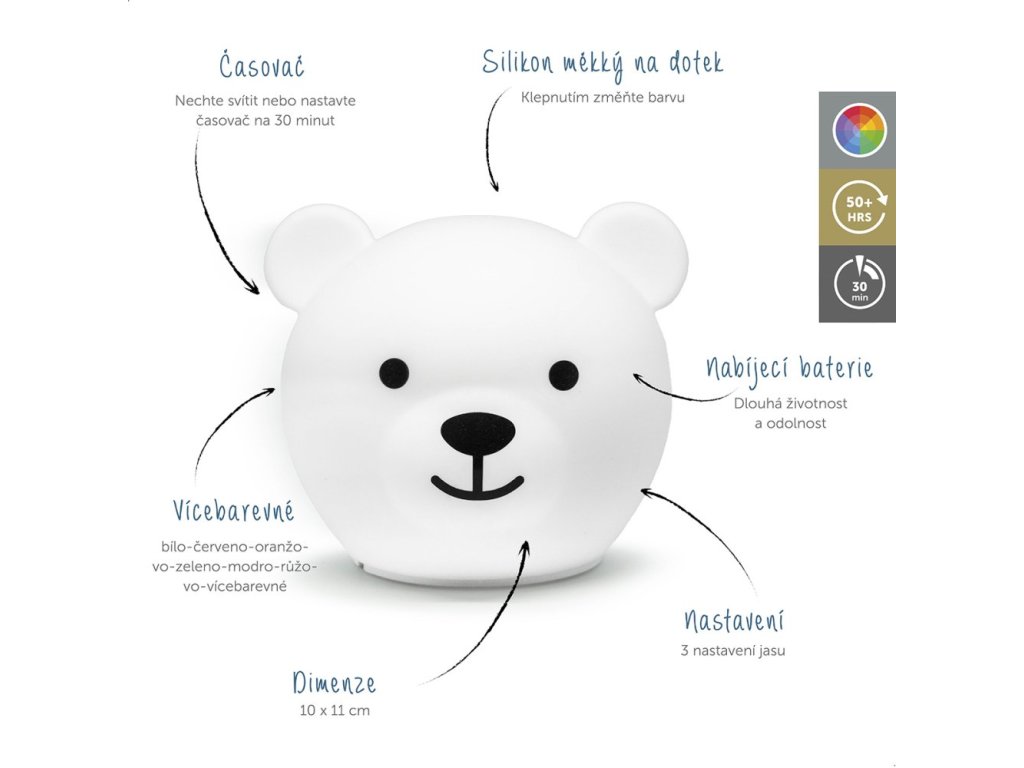 Jednoduchým poklepom na medvedíka je možné meniť farbu nočného svetla. Môžete si vybrať červené, oranžové, žlté, zelené, modré, ružové, biele a viacfarebné svetlo.