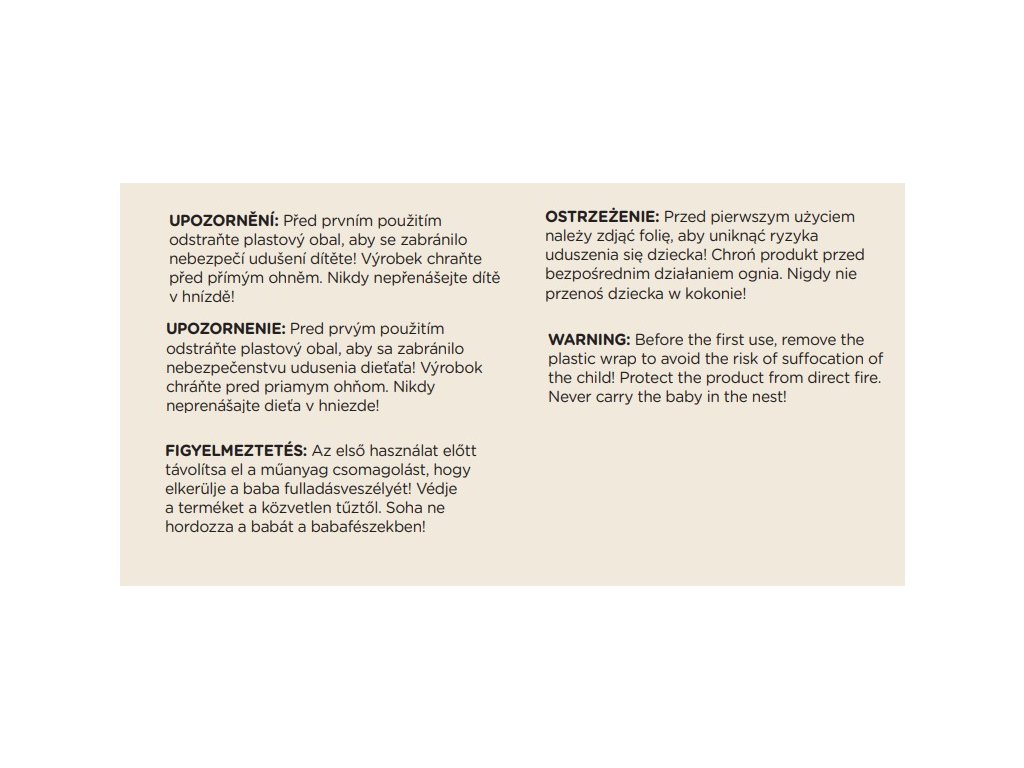 Pred prvým použitím odstráňte plastový obal, aby sa zabránilo nebezpečenstvu udusenia dieťaťa! Výrobok chráňte pred priamym ohňom. Nikdy neprenášajte dieťa v hniezde!