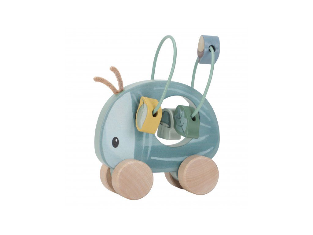 Darčeková sada obsahuje tri krásne drevené hračky s nežnou potlačou motívov zo života v lese. Hrkálka v tvare valčeka pri pohybe jemne cinká, skladacia hubka s chrobákom nabáda k rozloženiu a znovu zloženiu. Treťou hračkou je rozkošný chrobák na kolieskach so špirálou, na ktorej sa pohybujú drevené korálky v podobe žaluďa, listu a huby.