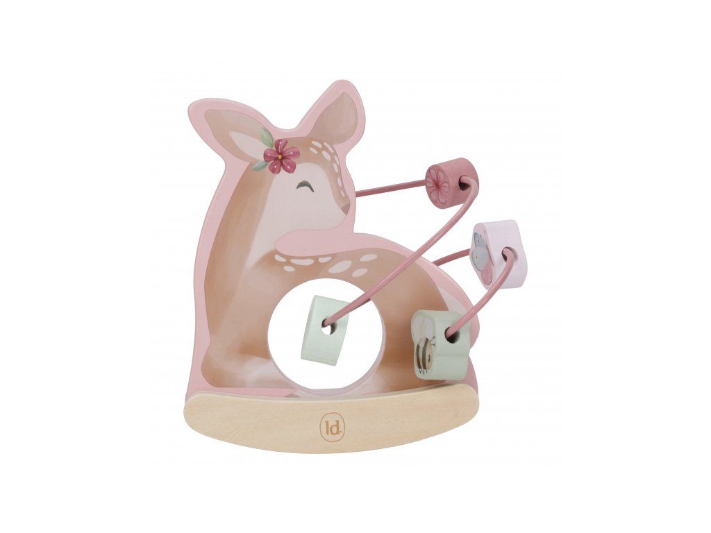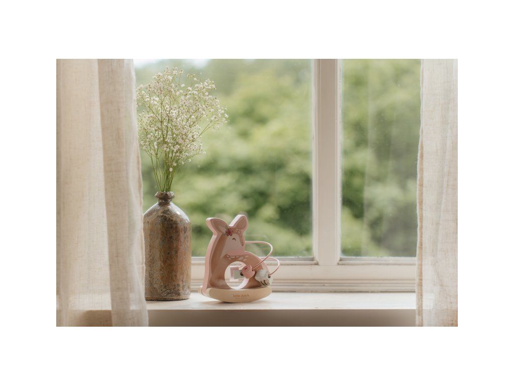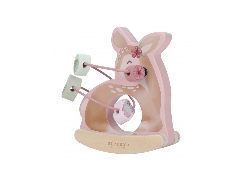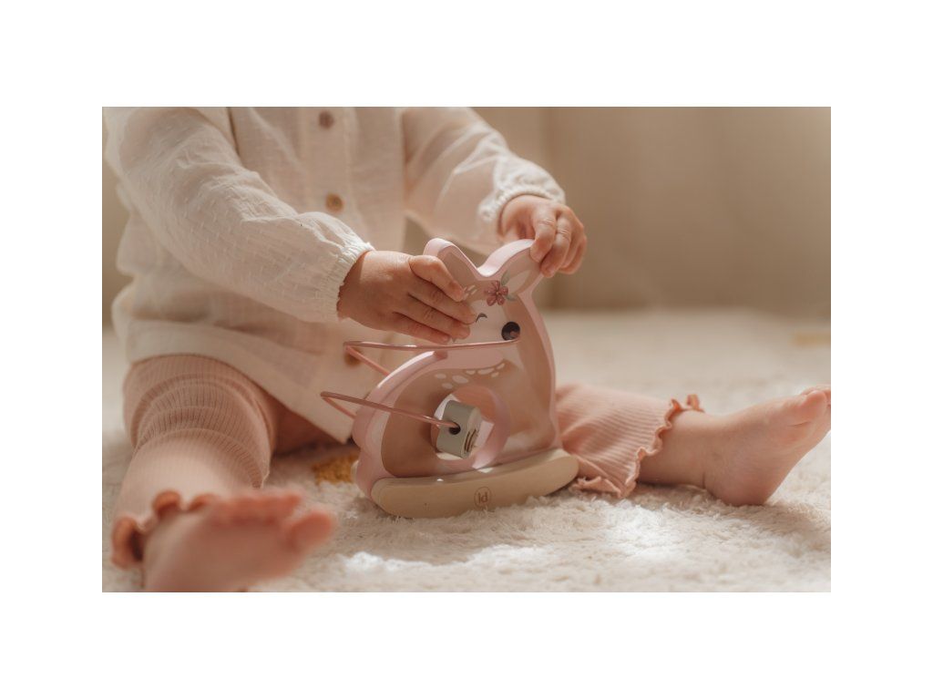 Drevená hračka v podobe nežnej srnky sa po postavení na podlahu či stôl jemne hojdá a pritom sa okolo nej na špirále pohybujú posuvné drevené korálky s potlačou včielky, motýľa, kvietky a lístka. Hračka je ideálna pre rozvoj koordinácie ruka/oko dieťaťa slúži aj ako krásna dekorácia v detskej izbe.