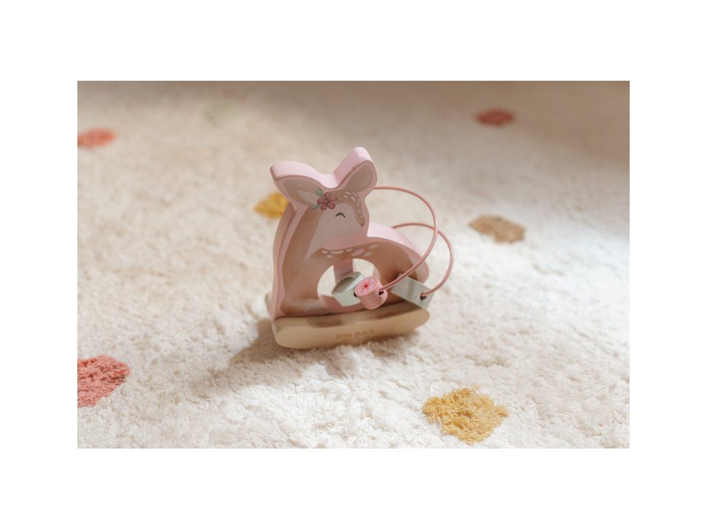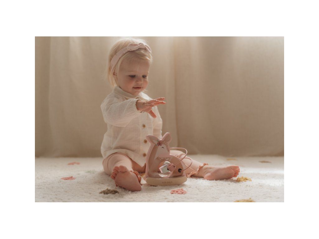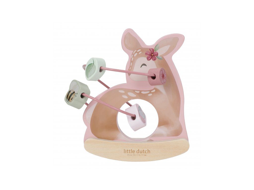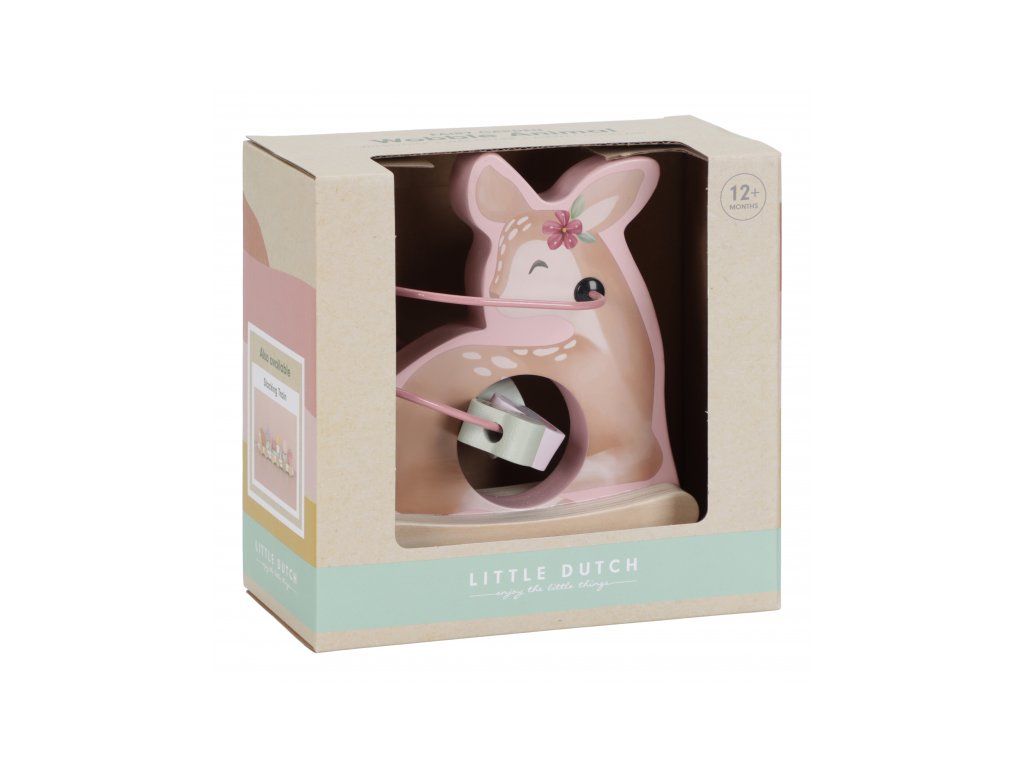 Drevená hračka v podobe nežnej srnky sa po postavení na podlahu či stôl jemne hojdá a pritom sa okolo nej na špirále pohybujú posuvné drevené korálky s potlačou včielky, motýľa, kvietky a lístka. Hračka je ideálna pre rozvoj koordinácie ruka/oko dieťaťa slúži aj ako krásna dekorácia v detskej izbe.