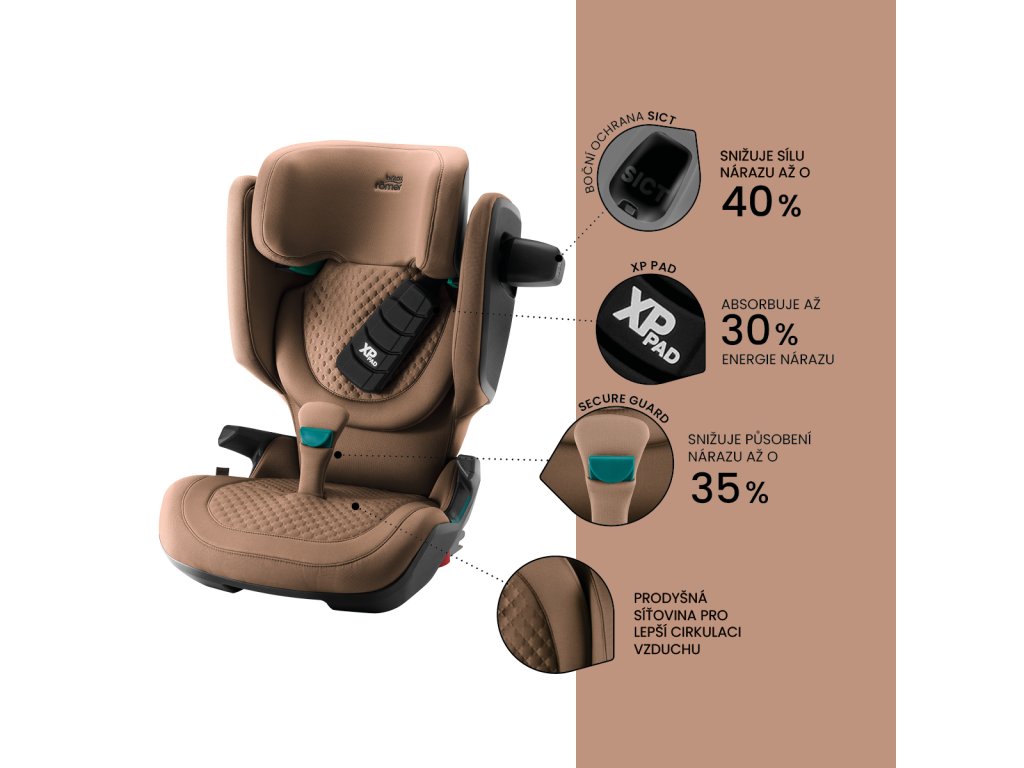 Kidfix Pro Lux vybavená jedinečnými bezpečnostnými prvkami proti čelnému nárazu – špeciálna penová podložka XP-PAD chráni citlivú oblasť krku a hrudníka, zatiaľ čo systém SecureGuard pridáva navyše 4. kotviaci bod, ktorý bezpečne zaistí správnu polohu pásu. Na ochranu pri bočnom náraze je autosedačka vybavená technológiou novej generácie SICT, ktorá teraz ešte lepšie absorbuje energiu a je prakticky pripojená k autosedačke, aby nedošlo k jej prípadnej strate. Starostlivo polstrované bočnice a ergonomická opierka hlavy v tvare V sú navrhnuté tak, aby poskytovali maximálnu ochranu a pohodlie dieťaťa v každej fáze jeho vývoja. Vodiče pásu sa zároveň postarajú o to, aby bezpečnostný pás vždy pevne a správne obopína telo dieťaťa.
