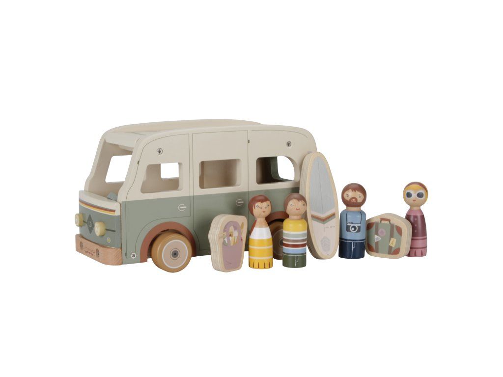 Obsah balenia: karavan, 4 figúrky, kufor, taška s jedlom a surf.